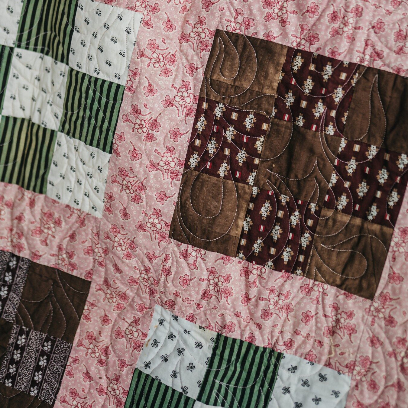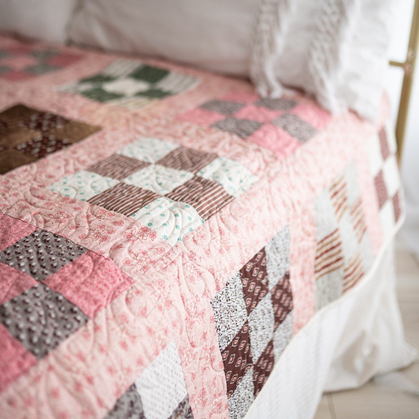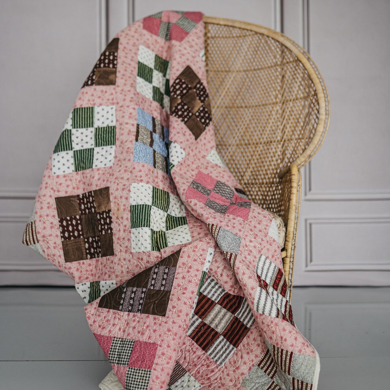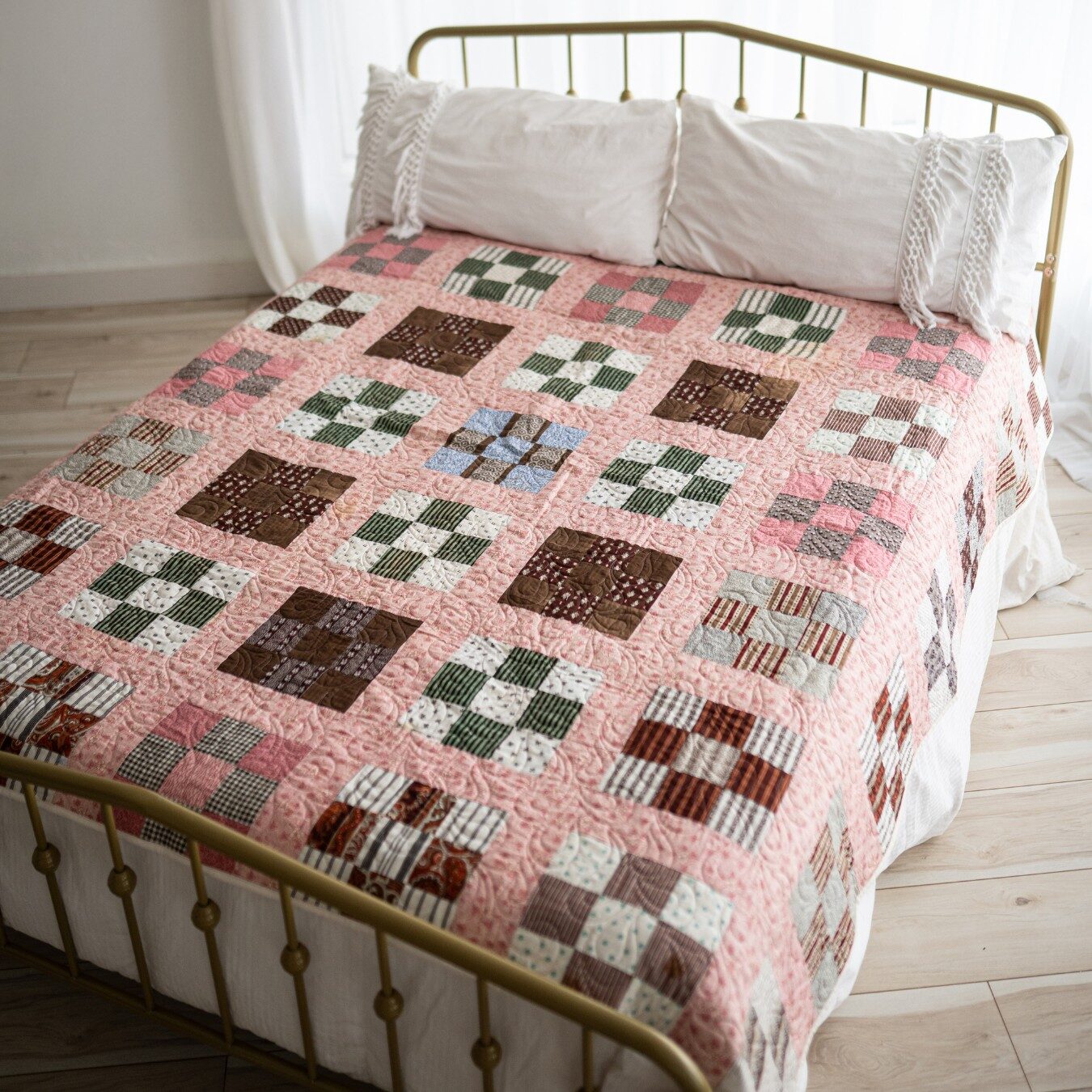 Soft, cheerful, and full of charm, Clara is a celebration of tradition and handwork. Measuring approximately 92 x 92 inches, this generous quilt features meticulously hand-pieced Nine Patch blocks, often referred to in historic quilt block references as the Album Quilt or Country Gentleman Nine Patch. The blocks are set with warm pink print sashing that lends the quilt its gentle, sun-kissed glow. The absence of borders allows the design to flow uninterrupted, giving Clara a clean, classic feel.