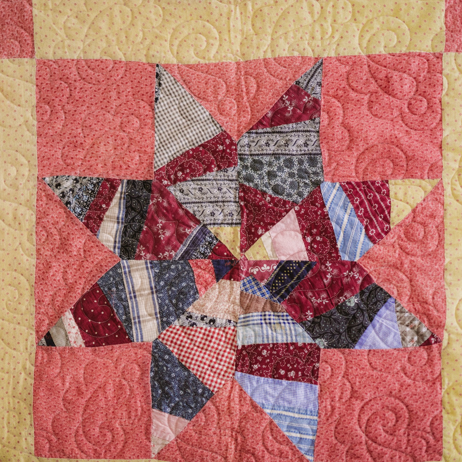 Wow! Dakota is more than a Star quilt—she’s a scrappy, spunky, spin-around-in-your-best-dress kind of Star quilt. The maker of the top that became Dakota knew how to use many colors in a cohesive, controlled way. She was able to show off a vibrant design while remaining playful, using solid sashing and her excellent hand-piecing skills when it came to the eclectic mix of fabric in the strip-pieced blocks. Measuring 64 x 74 inches, Dakota is a kind of collage of color and pattern.