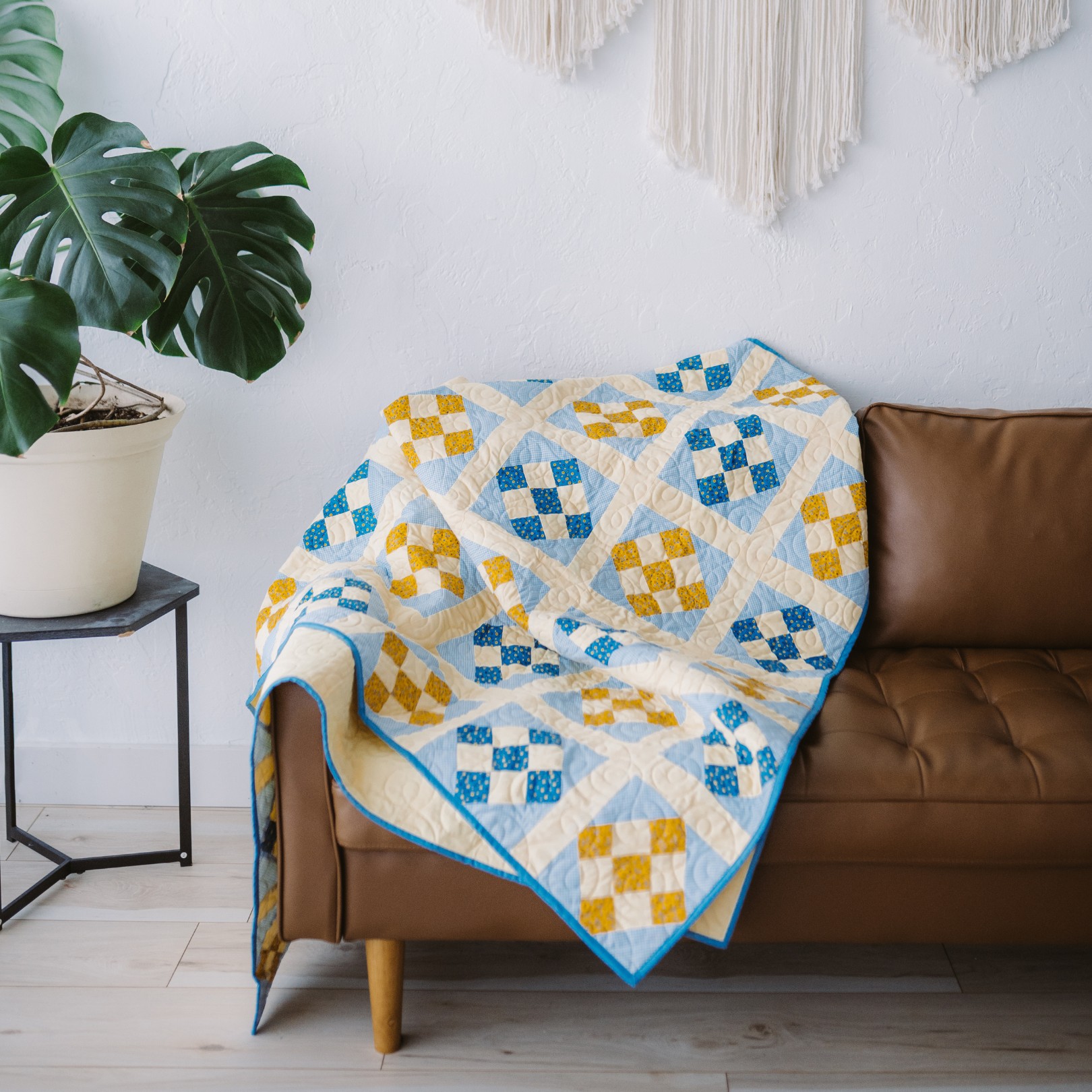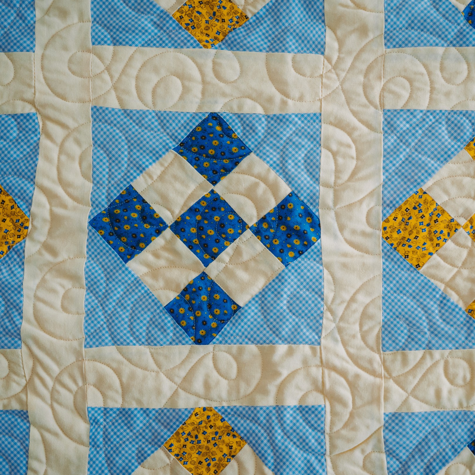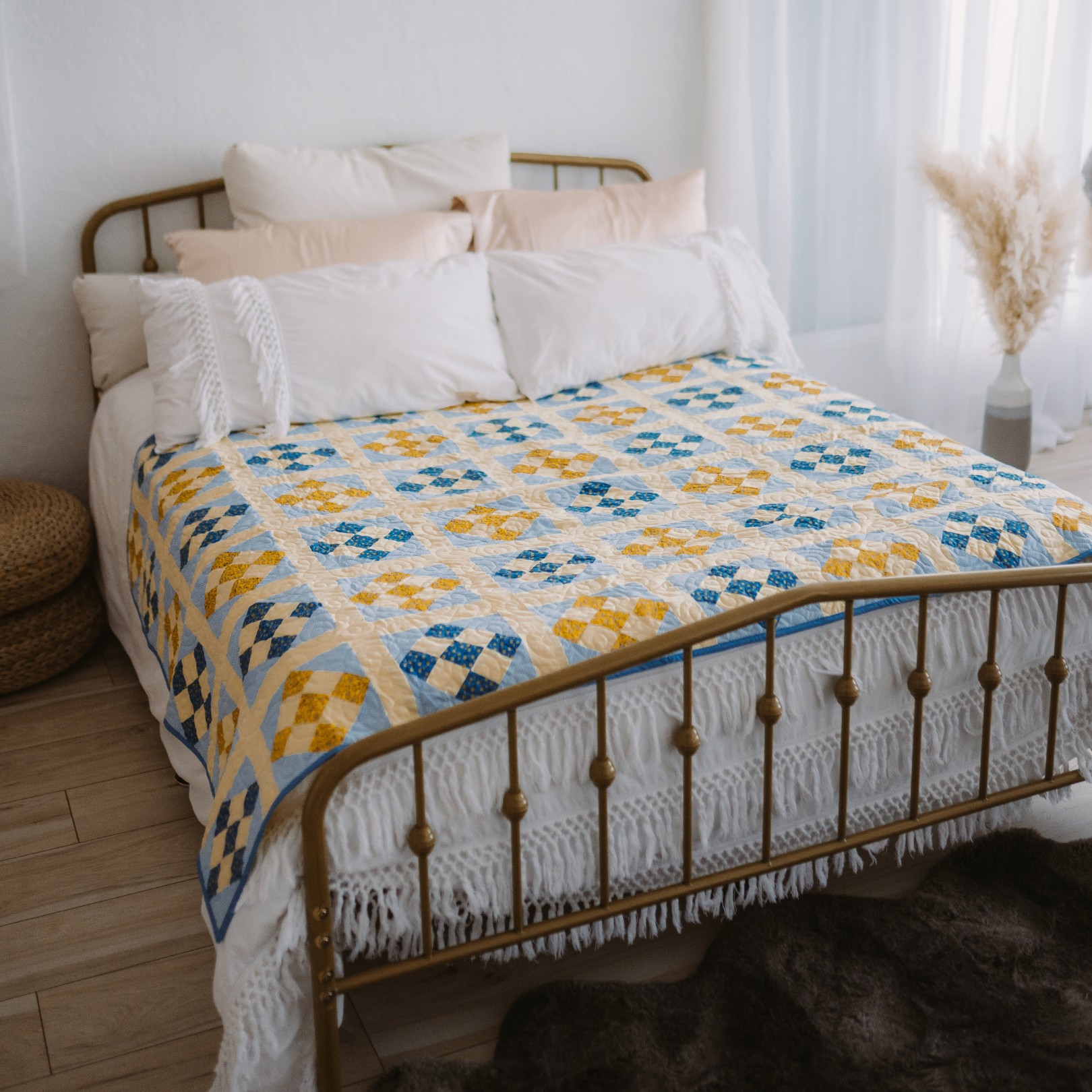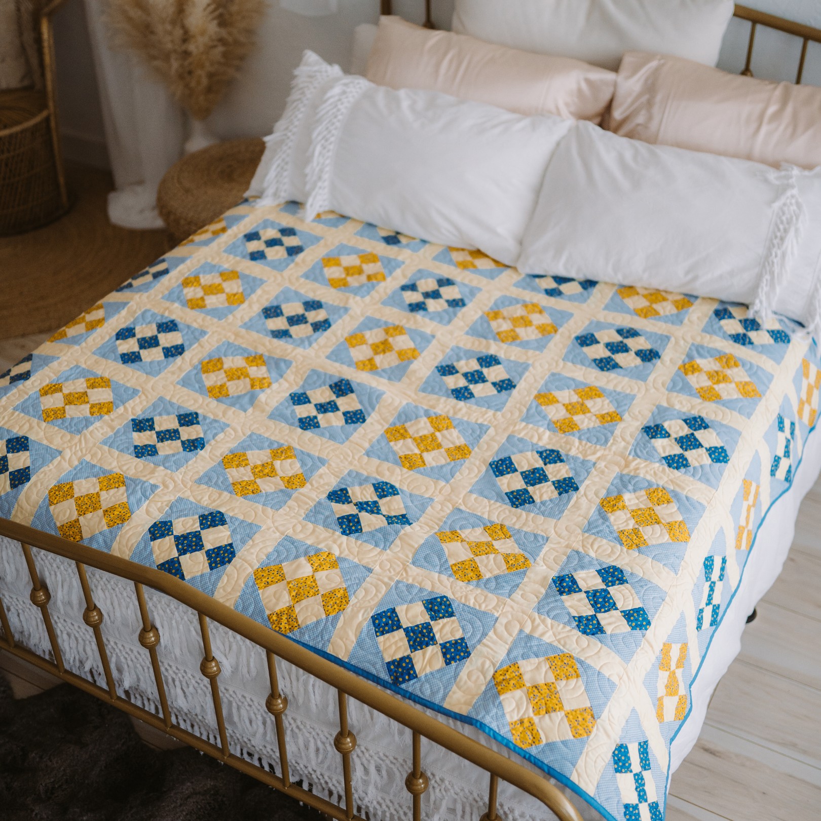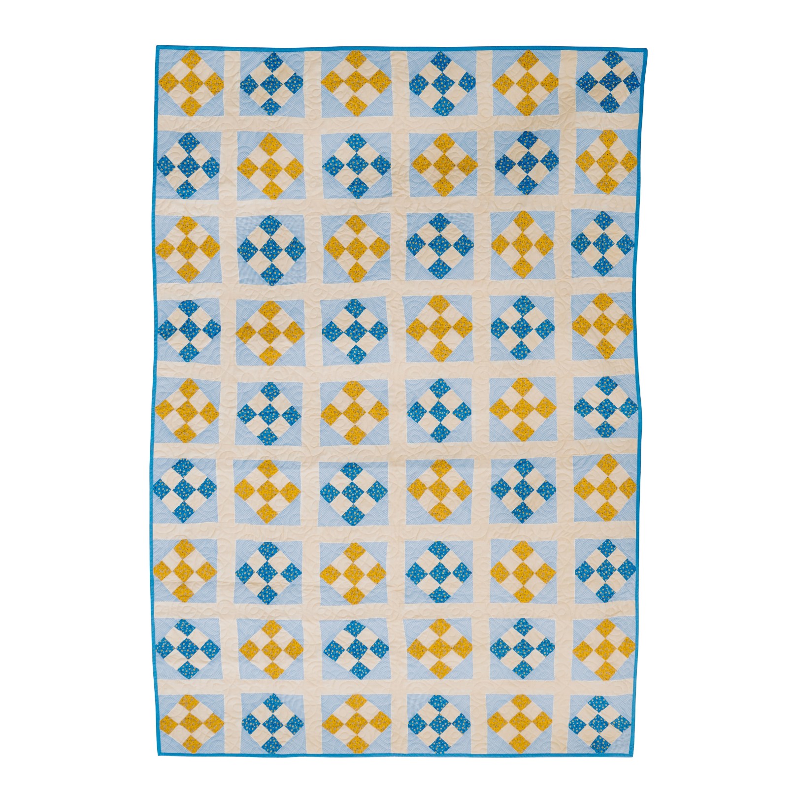 Dimensions: 59 x 84 in. Top source: Online seller. Original maker unidentified. Started: ca. 1930-1940. Finished: 2024. Description: Nine-patch on point. Backing/Binding: Kona Maize/Kona Evening. Finisher: Longarm quilting by Kennette Blotzer of Tall Trees Quilting. Quilting Pattern: All-over swirl. Condition: Excellent. Imperfections: Every Quiltfolk Foundry quilt in our shop began its life as an unfinished vintage top or collection of loose blocks. We seek out lost tops and blocks that are in good condition, but due to the source material’s age and care history, some imperfections in the finished quilts may be present. We hope you’ll see them as we do, just another part of the story.