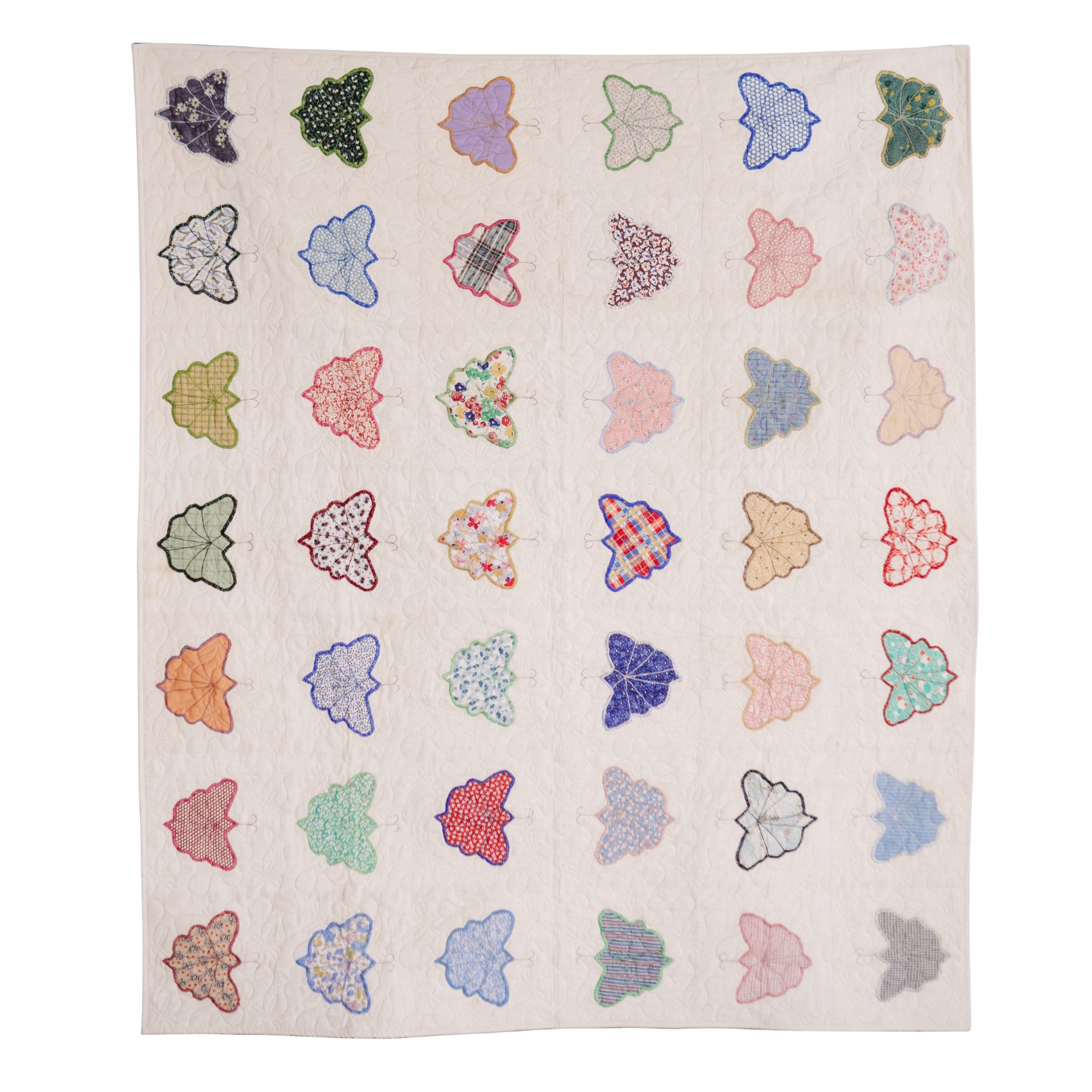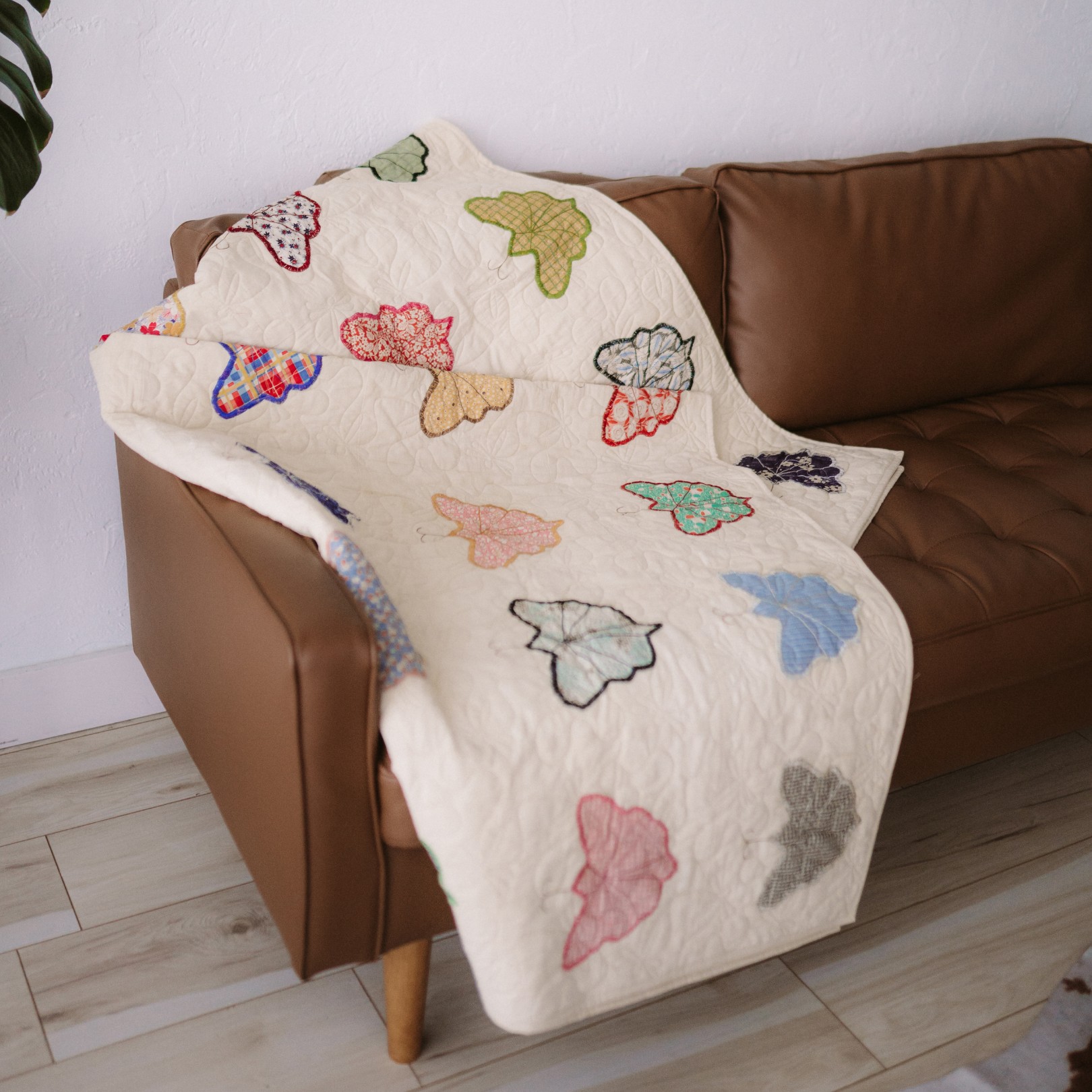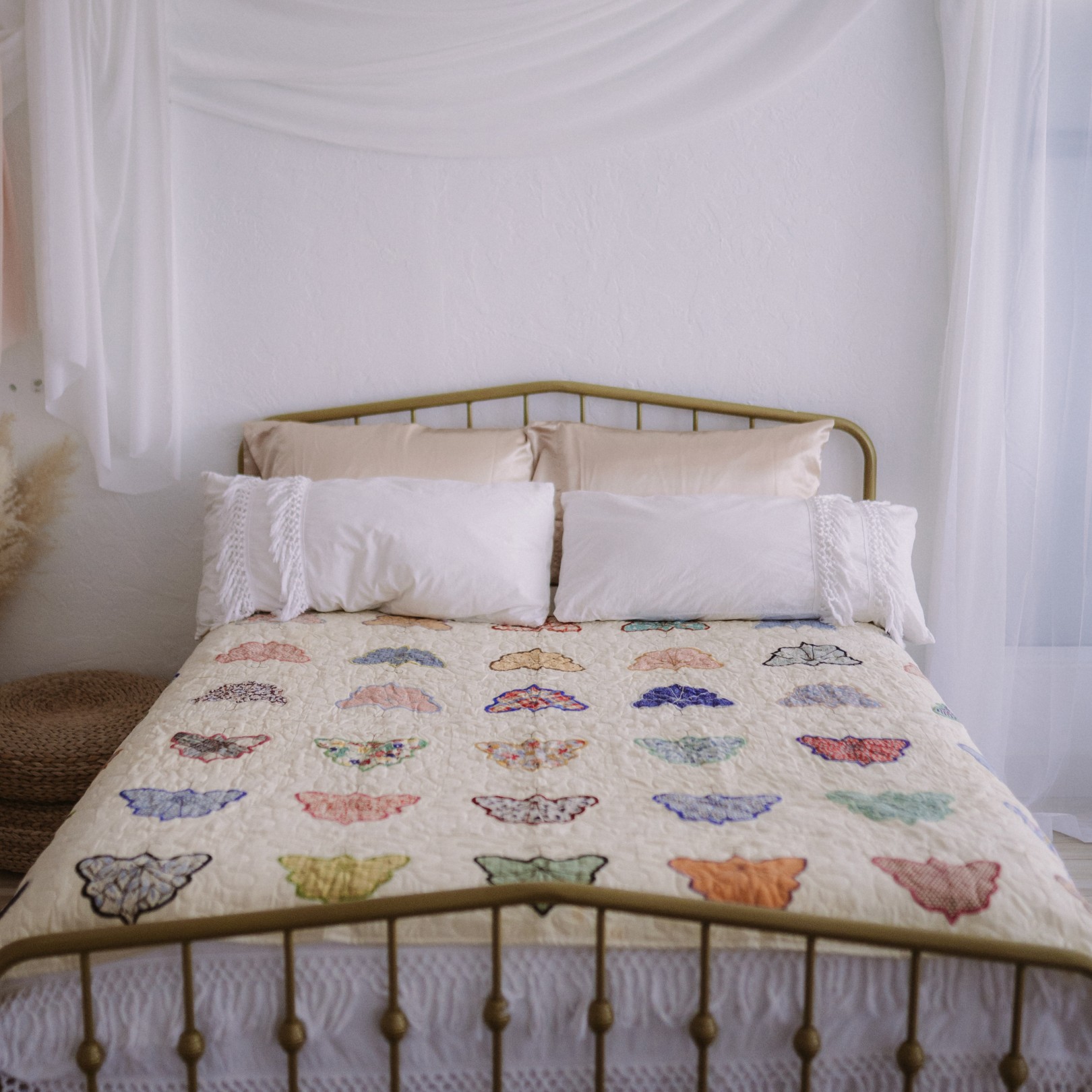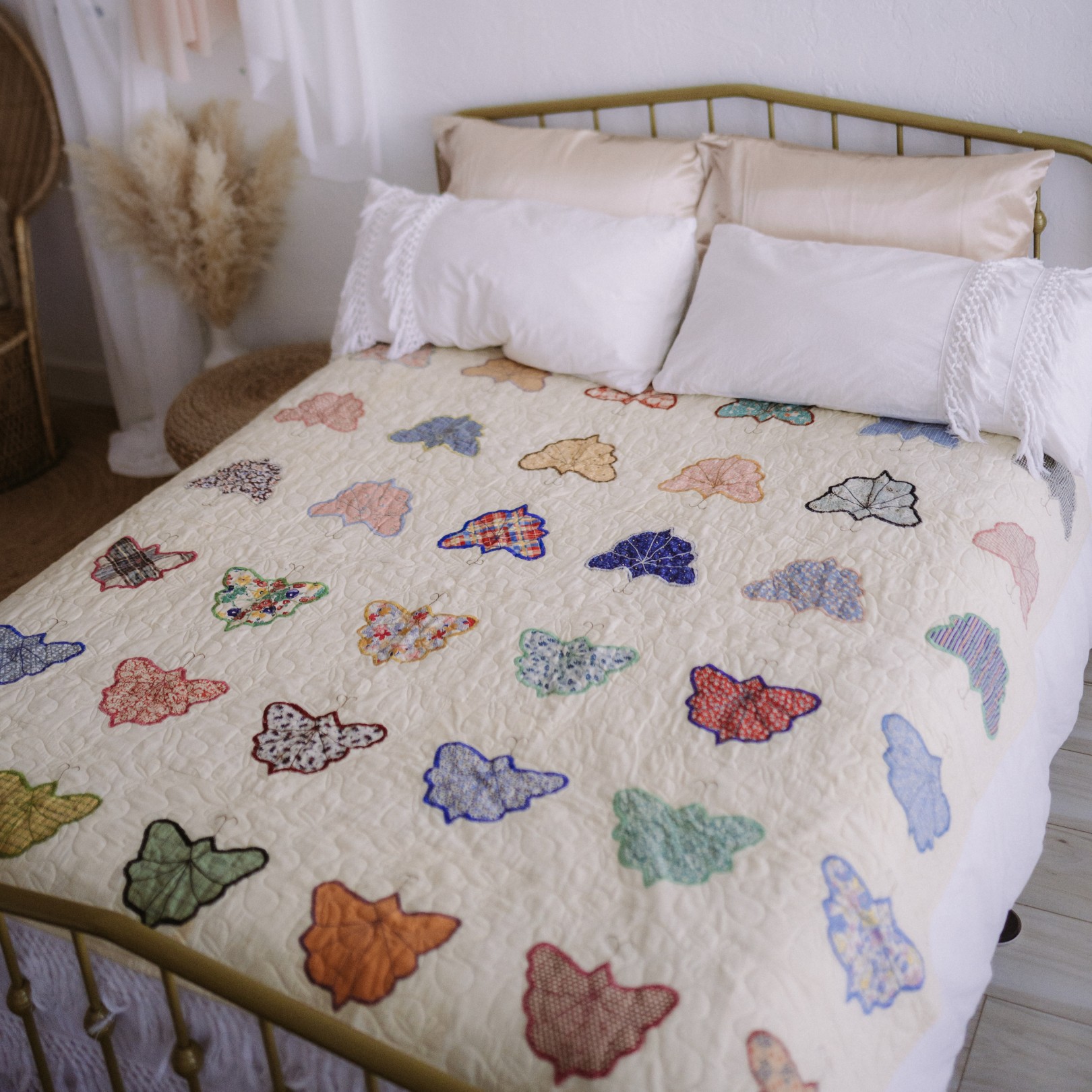 Delicate and whimsical, Bethany’s enchanting butterfly motif brings a sense of lightness and joy to any room. Measuring 68 x 78 inches, this quilt showcases masterful hand appliqué, with each butterfly lovingly secured using a tight buttonhole stitch and adorned with embellished centers. The subtle Kona Eggshell backing and binding offer a calming contrast to the playful pattern. And the intricate Dragonflies pattern, machine quilted by Kennette Blotzer of Tall Trees Quilting, adds movement and texture. Bethany is more than just a quilt—she’s a tribute to craftsmanship, nature, and beauty, ready to warm both body and spirit.