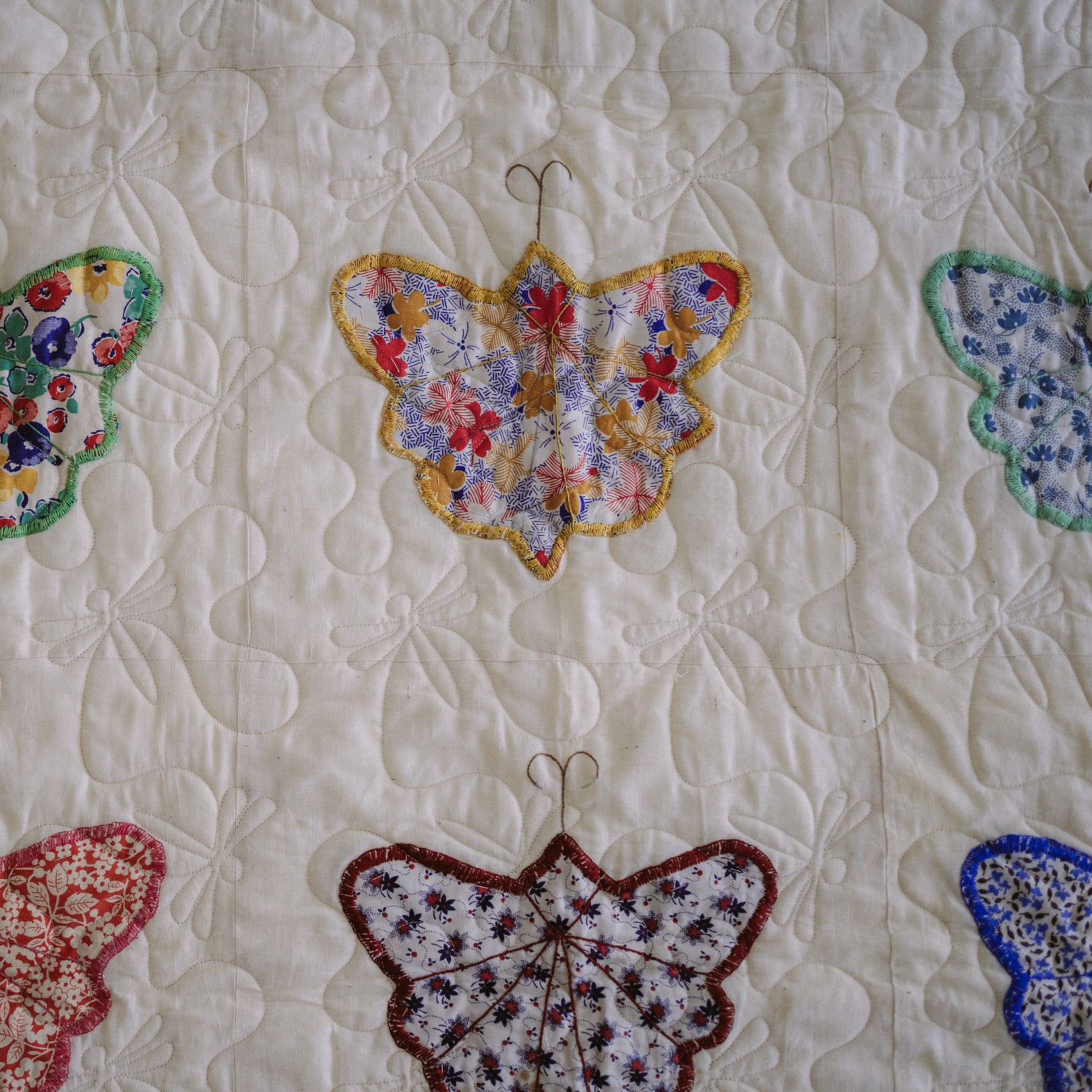 Description: Butterflies appliquéd with a tight buttonhole stitch and adorned with embellished centers.