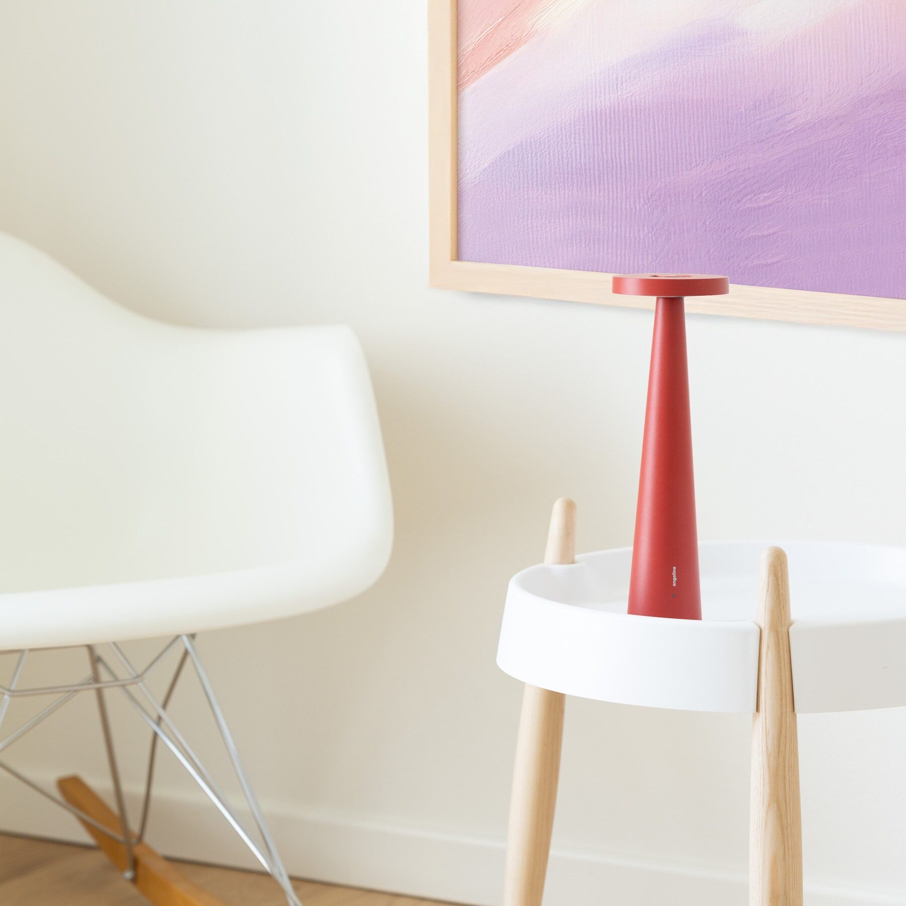 To recharge your Angelina Pro lamp, plug the provided charging base into an outlet and place the lamp on the base. The indicator light on the base will glow red while charging and turn green once the charging cycle is complete. A full charge takes around 3 to 4 hours. The fully charged lamp may remain on the charging cradle without damaging the battery while the lamp remains off. We recommend cleaning using only a soft, dry cloth. The use of aggressive cleaning agents or abrasive cloths, or any accidental knocks, may damage the finish.