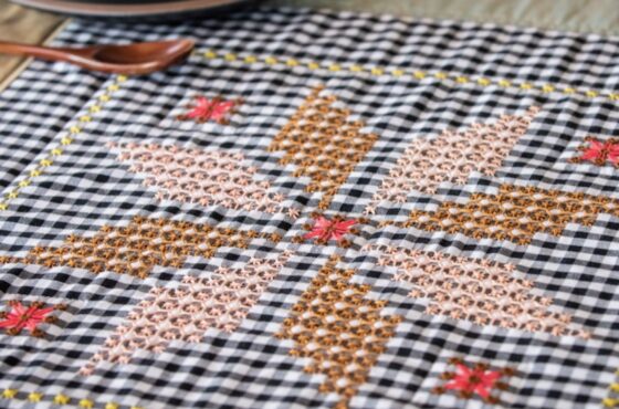 Join us and learn the relaxing technique of chicken scratch embroidery to make a gorgeous table runner designed exclusively for workshop participants!