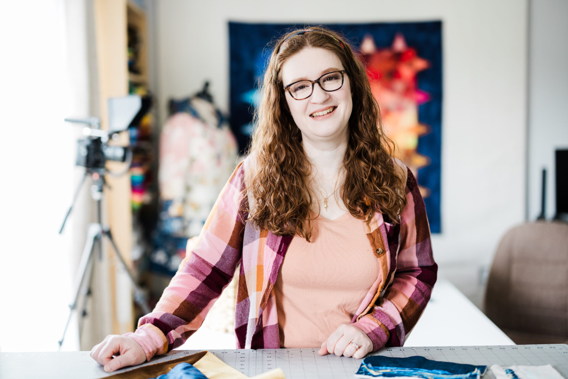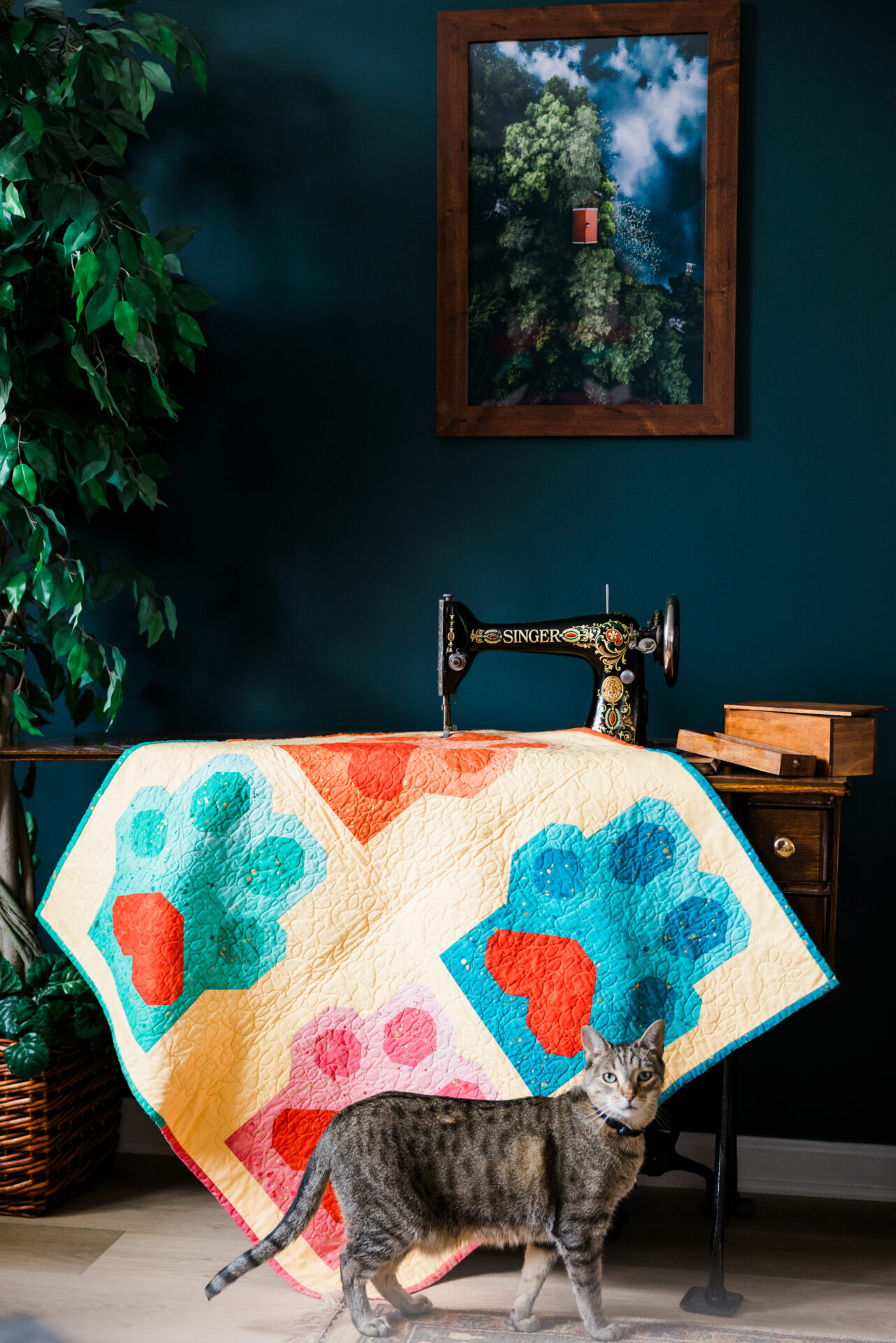 Eva spoke to Quiltfolk from her studio, while a curious kitty named Bobby tiptoed across her cutting table in the background. “I stopped sewing in middle school when it wasn’t cool to hang out with your grandma anymore,” she said with a wry smile. But she carried the skills she learned with her, altering her own clothes throughout college.