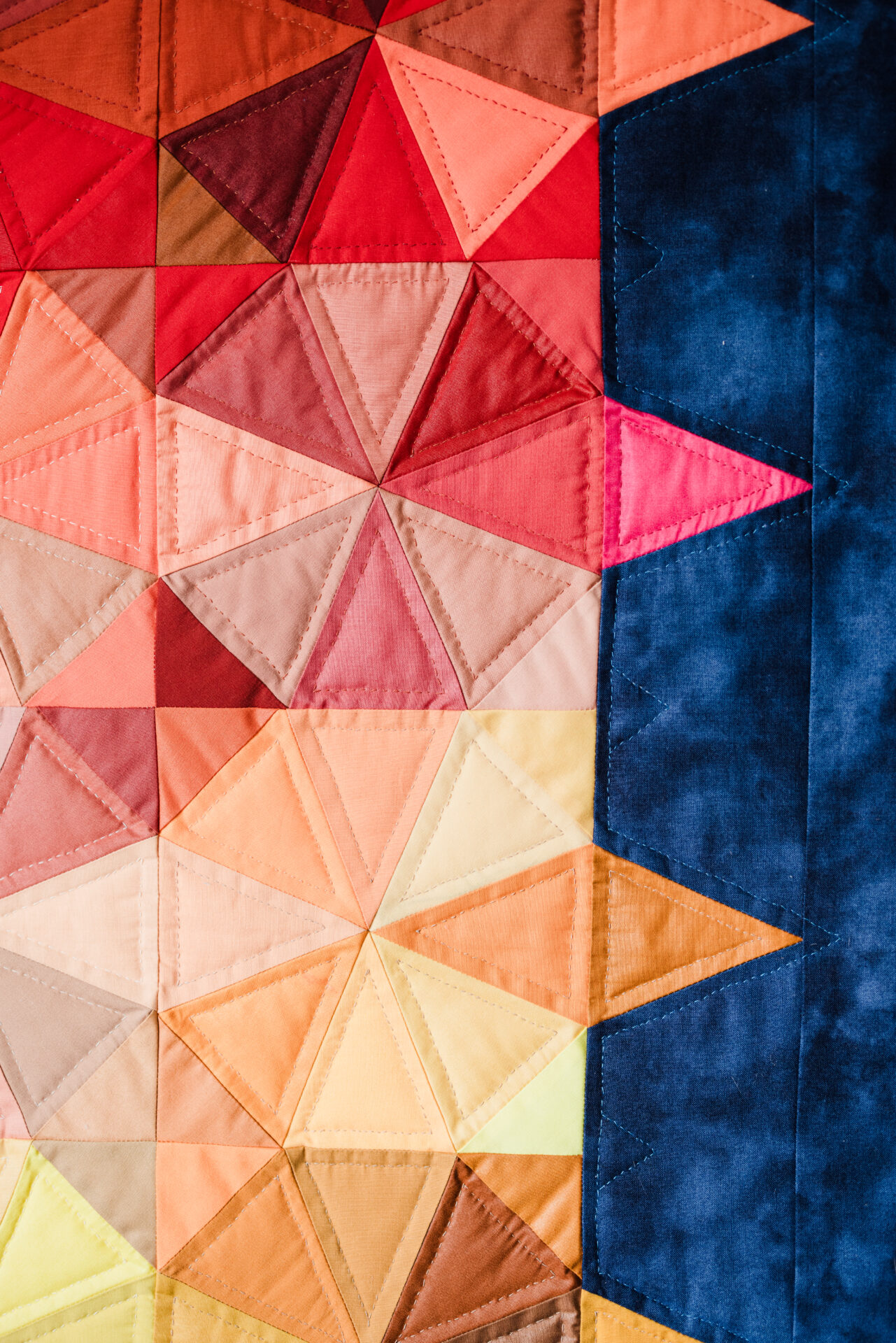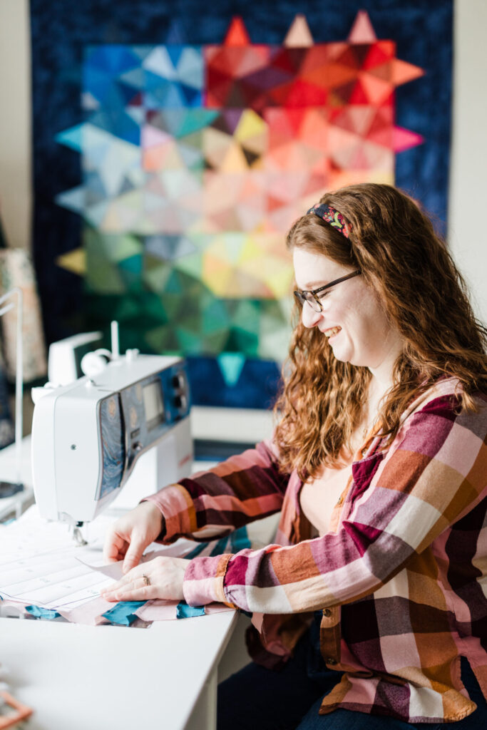 Inspired by Slice of Pi Quilts’ Exploding Heart quilt pattern (and with the designer’s blessing), Eva created the Exploding Pizza quilt, first for her husband—and then, as a pattern to sell in 2022. Now motivated to continue designing, Eva has since created different serialized patterns, with one motif having a pillow or bag to accompany the main quilt pattern.