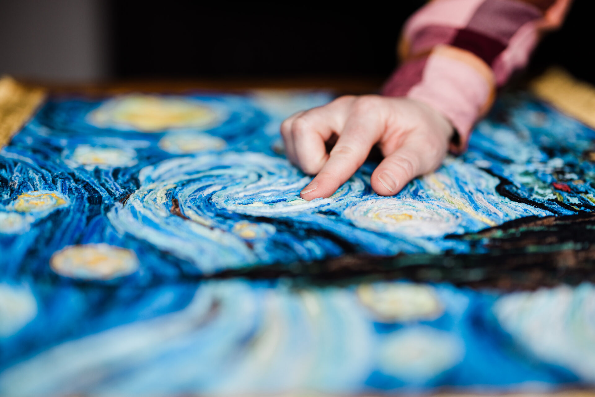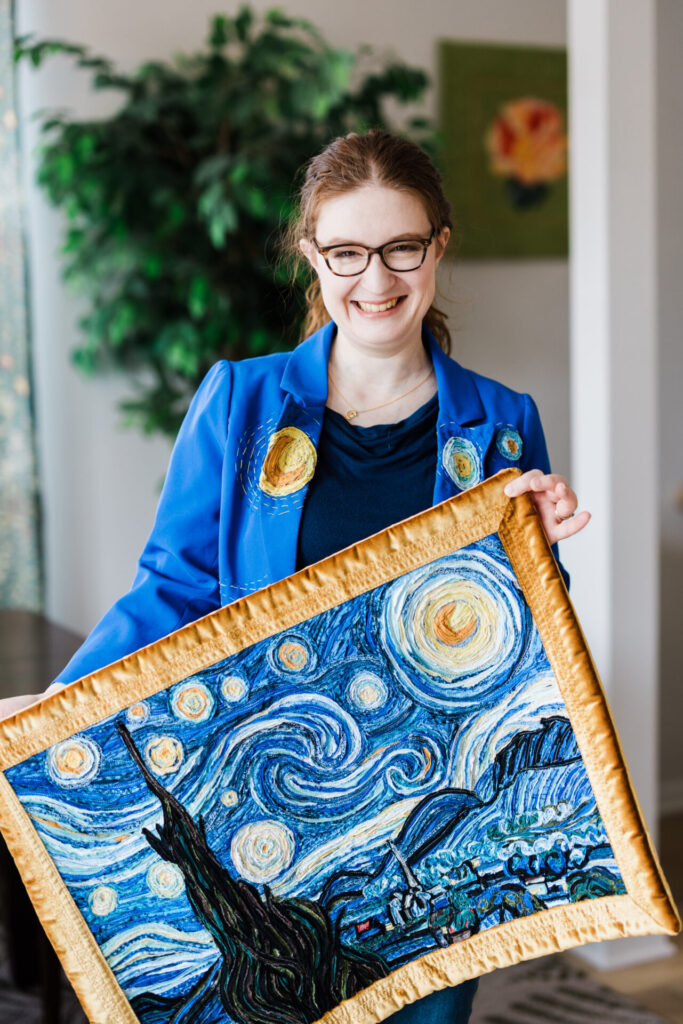 Wanting to move further toward improv, Eva turned to Vincent van Gogh’s 1889 oil painting The Starry Night next as inspiration. During the early stages of her exploration, Eva discovered that she could “paint” with narrow strips of fabric and set about recreating a treasured work of art. Her quilt painting is a stunning recreation of The Starry Night—each of van Gogh’s swirling dabs of paint meticulously interpreted with fabric and thread. The night sky overlooks the tiny village nestled next to mountains, watched over by a bright moon.