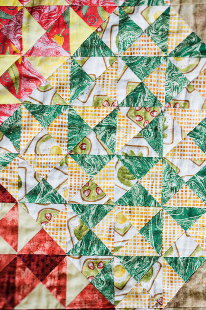 Eva began to build her skills by making quilts from patterns, and then, one day, her husband saw her cutting fabric and mentioned the “pizza cutter” she was using. After she explained that it was a rotary cutter, he excitedly asked if she could please make a pizza quilt.