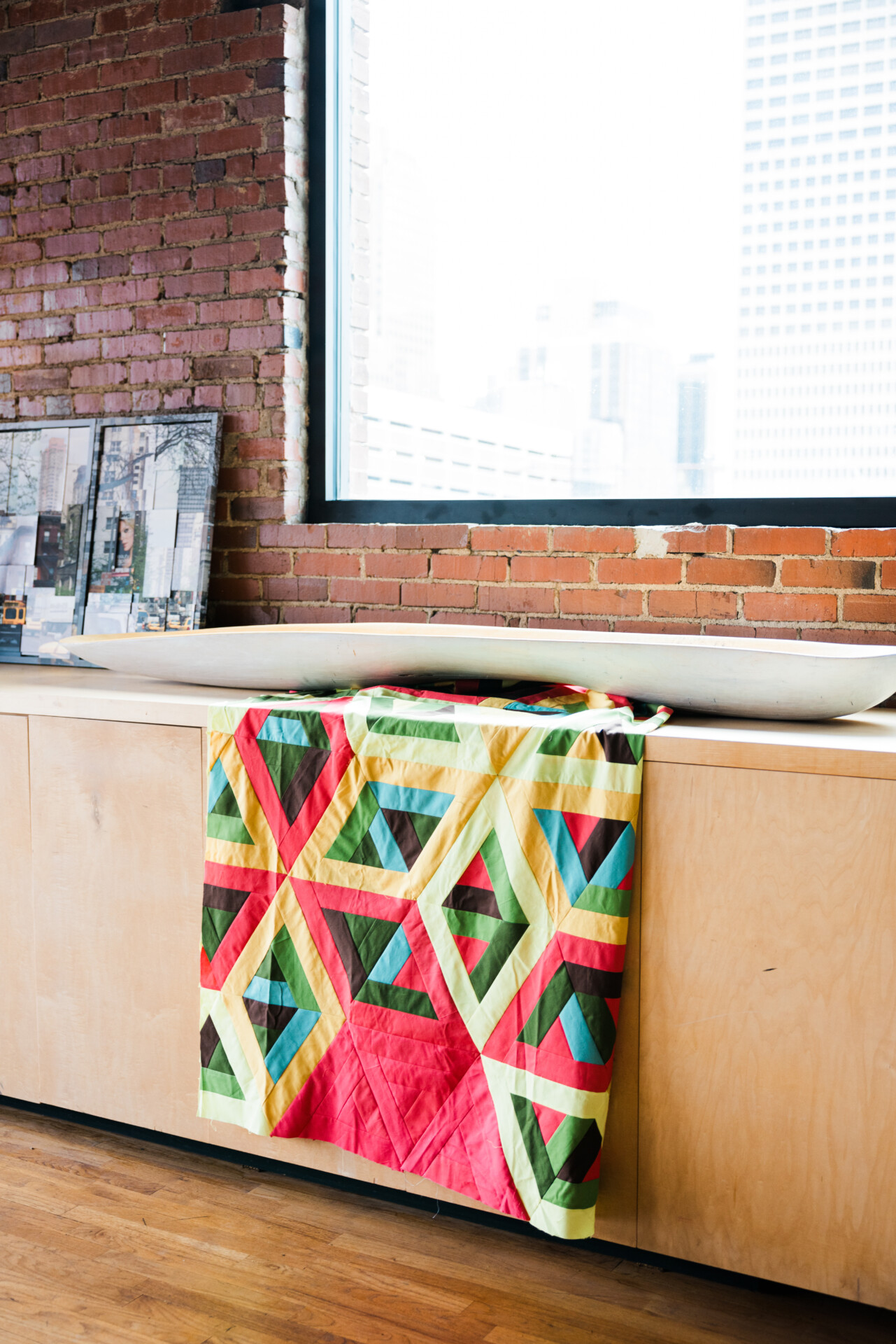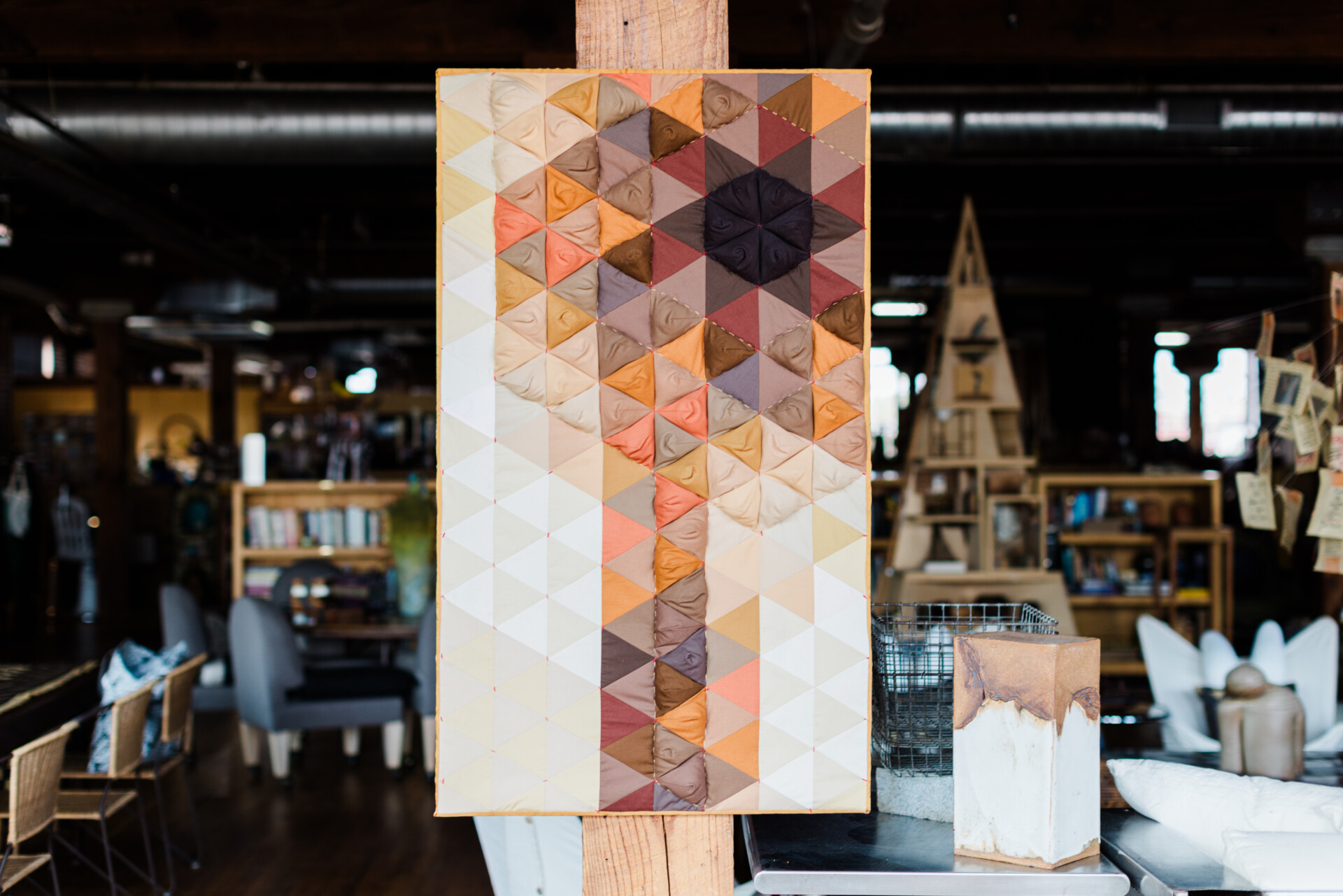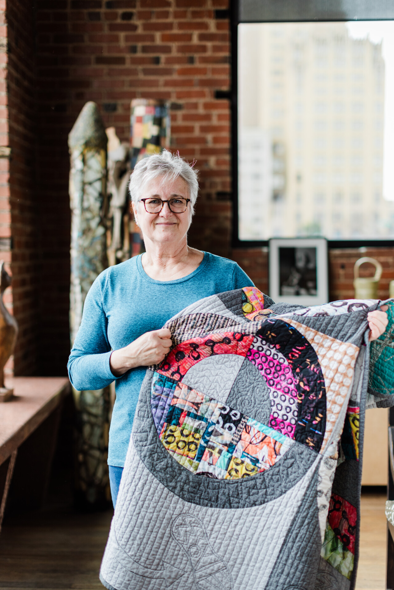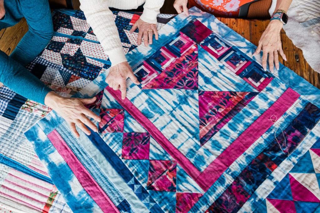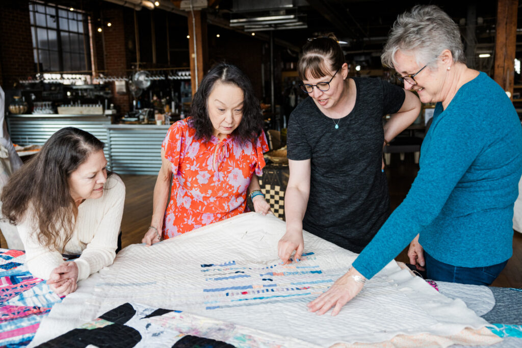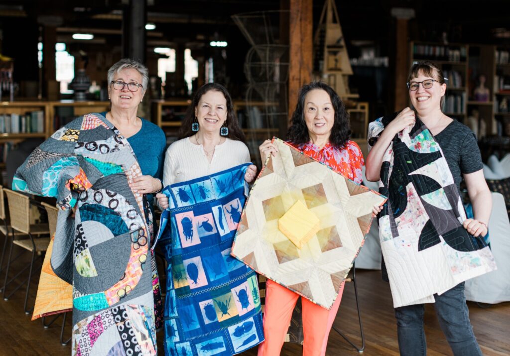 Ann is also one of the founding members of an art group known as Qu’aint. This collective is made up of five modern quilters and one contemporary painter, Jason Wilson, whose canvas paintings emulate geometric shapes and colors often associated with quilts. In addition to Ann, the quilters are Sarah Atlee, Elizabeth Richards, Brenda Esslinger, and Agnes Stadler. The six artists inspire, support, and continually push each other to express new ideas through fine art. Qu’aint has hosted several exhibitions, and they’ve even been featured by local media outlets.