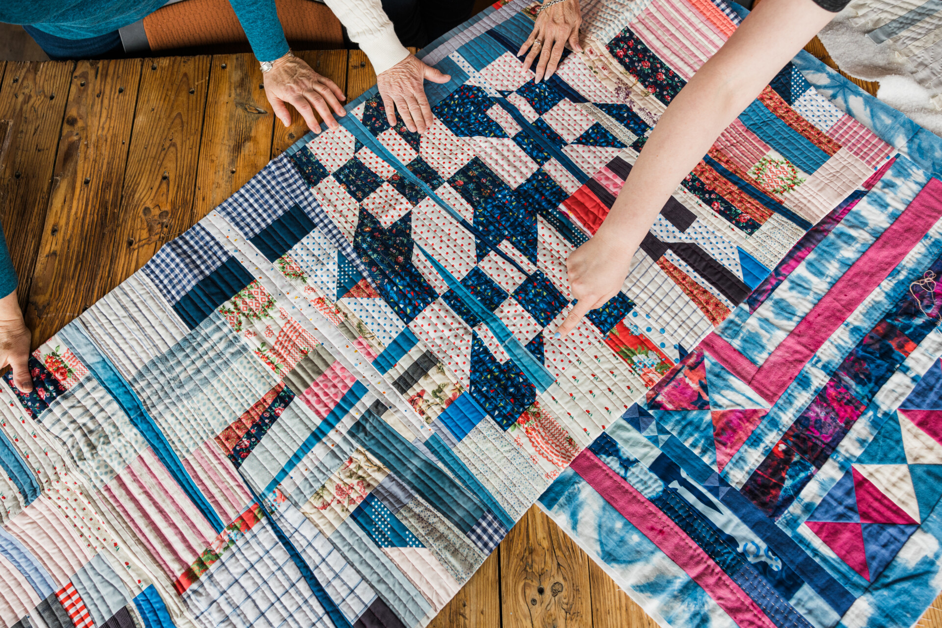 “The quilters in Qu’aint have made a few quilts based on Jason’s paintings. And Jason has also used our quilts as the basis for a series of paintings,” Ann explained. The interesting collaboration between paint and textile has inspired each artist to think in new ways and ultimately helped elevate their creative output.