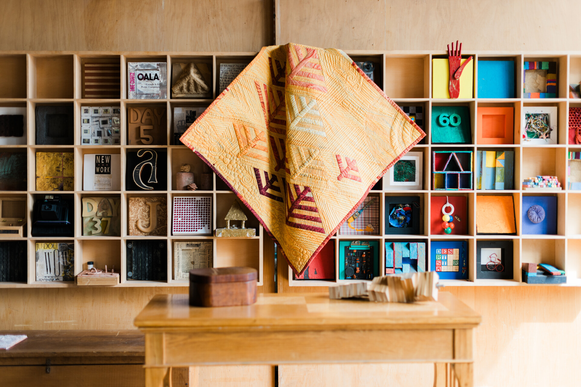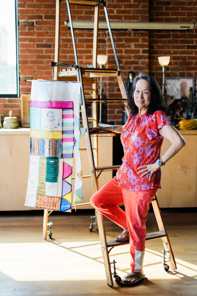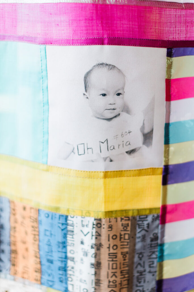 For an innovative hanging textile creation, Ann incorporated specially printed textiles featuring copies of the Korean documents from her adoption. These are pieced into a collage using a traditional Korean sewing technique known as bojagi, but while most bojagi is hand-stitched, Ann figured out a way to stitch hers on the machine.