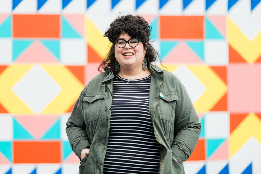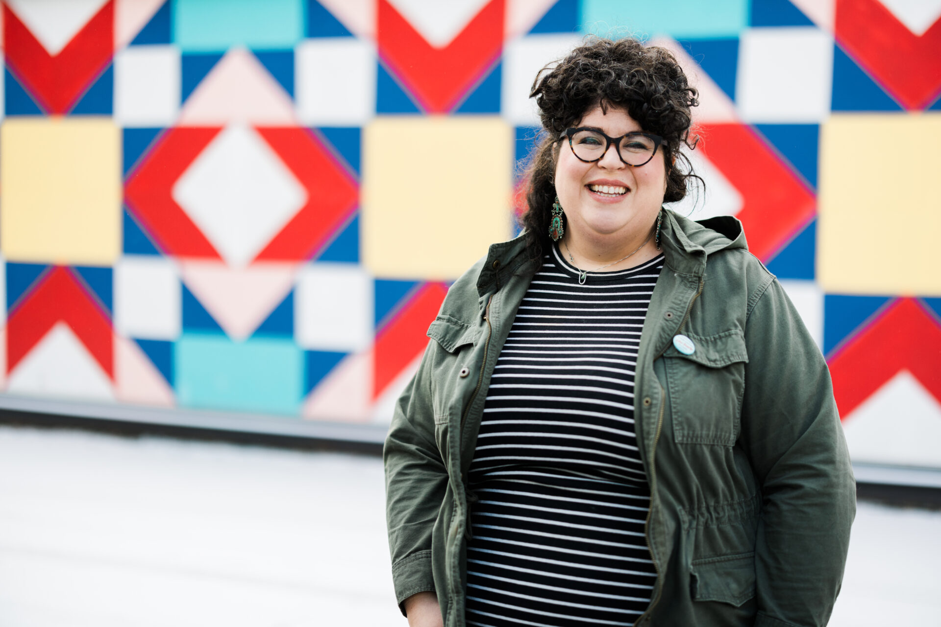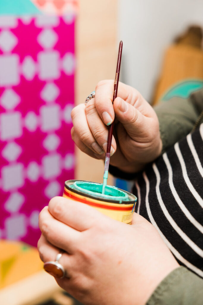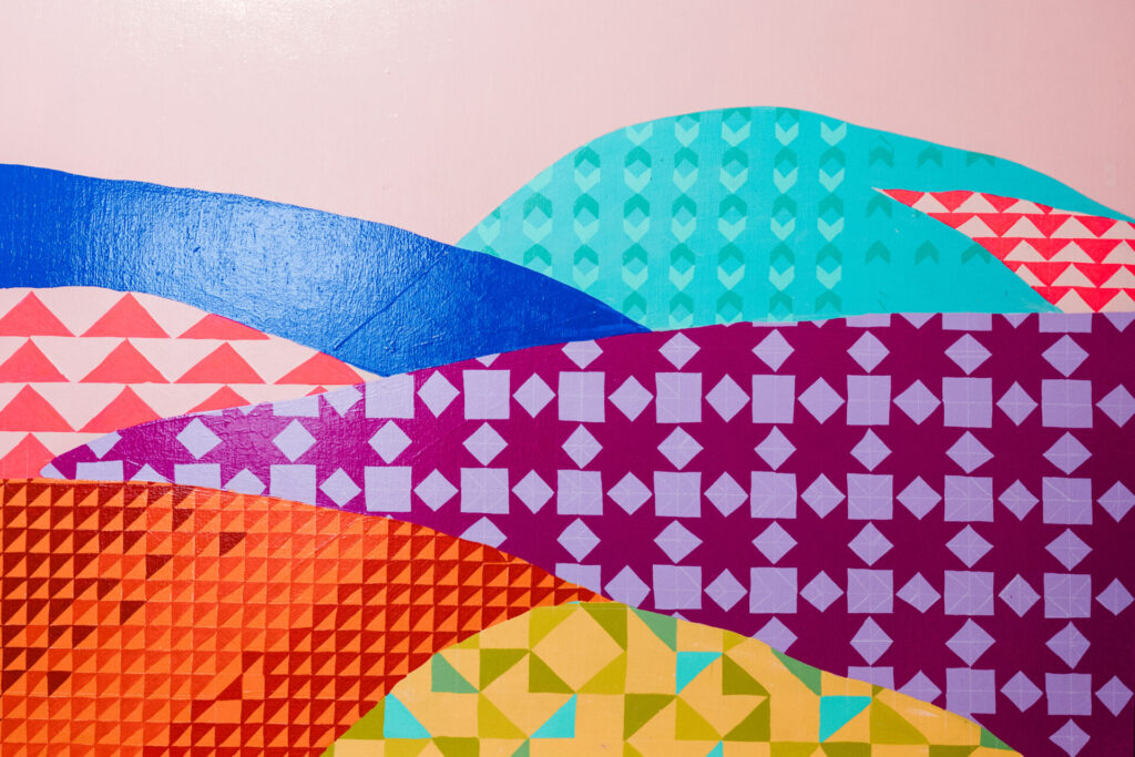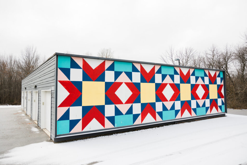 Spreading warmth and comfort is Olivia’s mission through her art, and she wants it to be accessible to everyone. More than a decade ago, she began painting quilt squares—first as small art pieces and later transforming walls and buildings into her canvas for the community to experience. Her goal has remained the same—to weave art into everyday spaces, bringing people together through color and design. Olivia was inspired by the feelings of warmth and comfort she felt as a child, wrapped in wedding ring quilts passed down by her great-grandmother. “They always sat in a special basket in our living room, kind of on display and out in the house,” Olivia said.