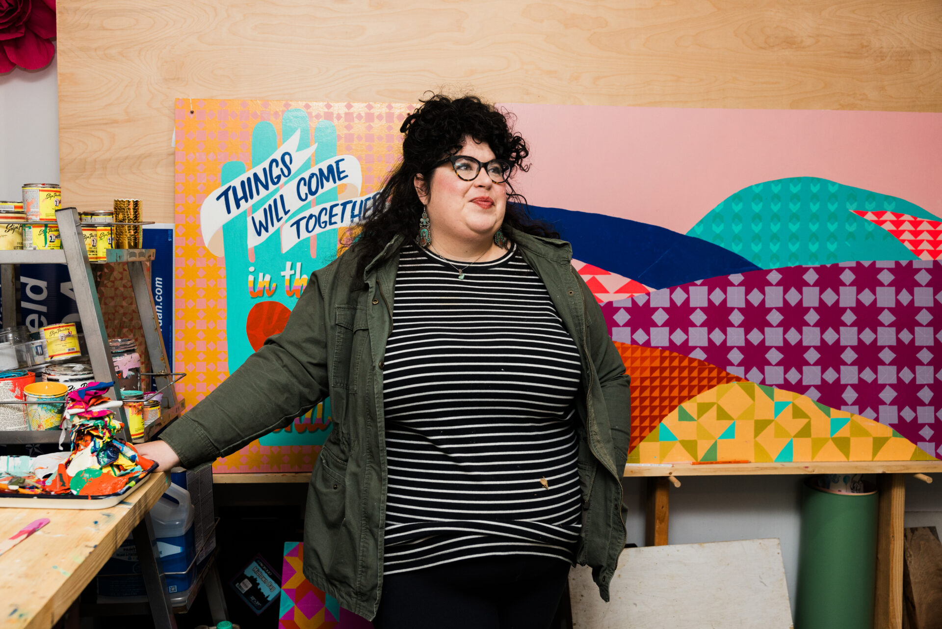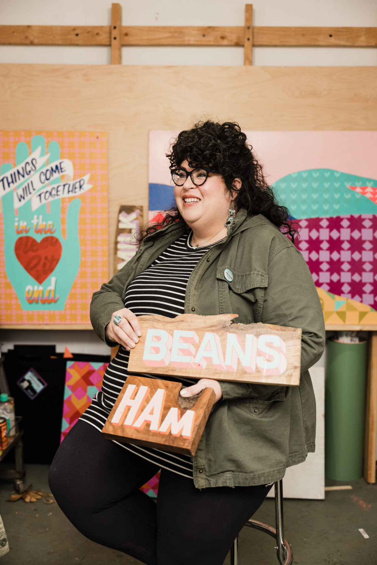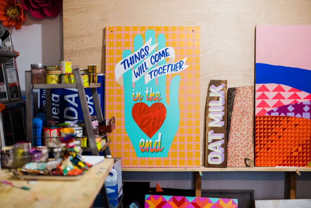 As a sign painter and muralist, Olivia’s use of big, bold colors and letters aligns with messages of love, gratitude, and hope, urging viewers in and around her native Fayetteville to embrace notions to “Love Your Neighbor” with messages like “Love Wins.”