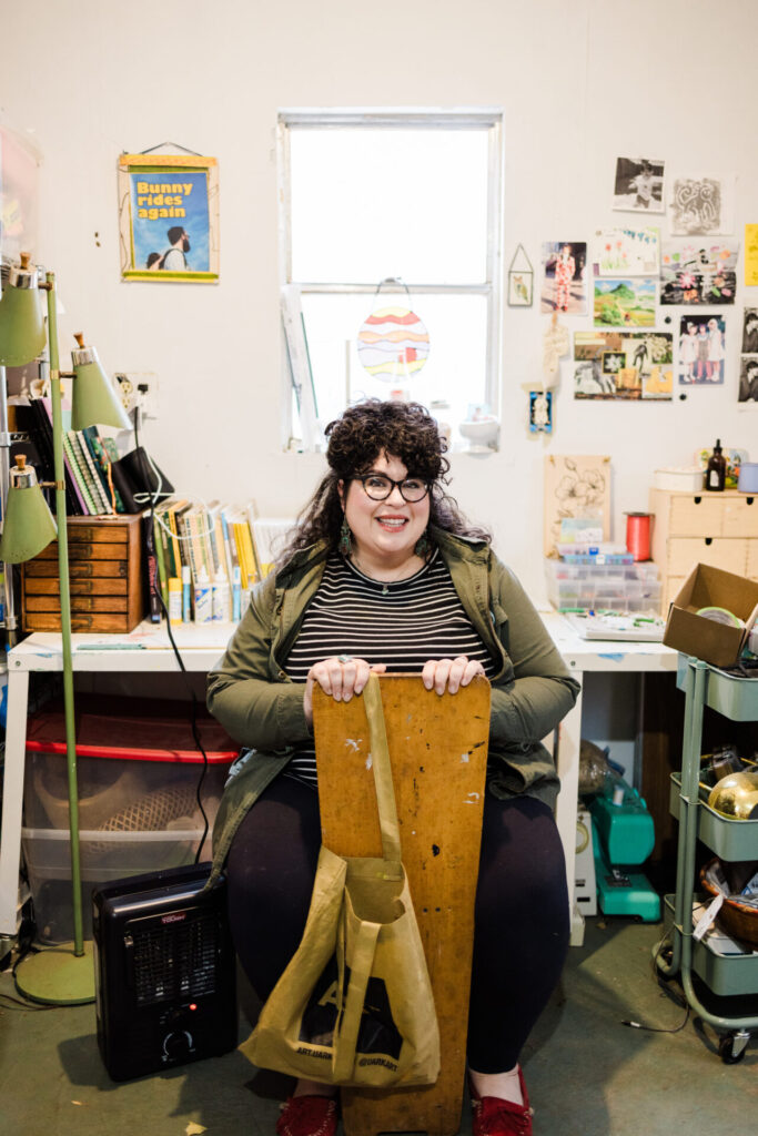 Olivia also dreams of working with the Woody Guthrie Center in Tulsa, Oklahoma, where she hopes to paint a quilt background overlaid with the phrase “Don’t Get Lonesome.” A longtime fan of the folk singer, Olivia was inspired by his 1943 New Year’s resolution, when he wrote those words—a sentiment she resonates with. “I think it’s the best phrase, ‘Don’t Get Lonesome.’ That’s a great reminder, and something that people need,” she said.