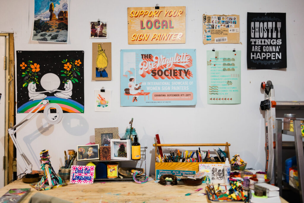 A sixth generation Ozarker, Olivia began her painting career in 2011 after being inspired by a documentary called Sign Painters. Though her stepfather is a sign painter and has offered his advice along the way, she is self-taught and the founder of Sleet City Creative, the brand under which she paints. And it didn’t take long for her work to catch on. At an independent craft show, where she had a booth, she connected with Onyx Coffee Lab, a well-known coffee roaster with locations in Northwest Arkansas. Onyx asked her to paint a sign, which led to commissions from other indie businesses.