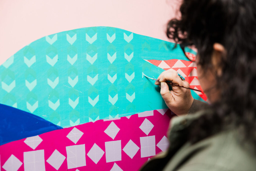 The quilts Olivia Trimble creates aren’t crafted with fabric and thread—but with paint, transforming walls into vibrant tapestries of home and comfort.