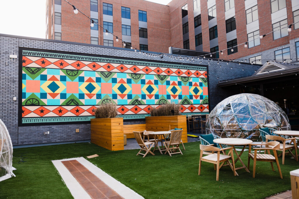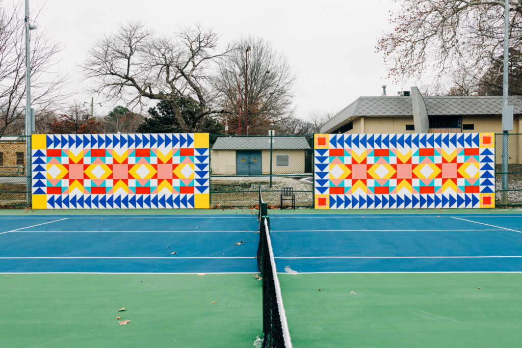 Olivia’s latest quilt murals include a tiki-inspired piece designed for the outdoor lounge at a new Motto by Hilton hotel in Bentonville. Her work can also be spotted in Fayetteville’s iconic Wilson Park, where she added two 224-foot pieces to cover backboards for tennis players to practice their aim. The flying geese she painted around the border give the mural a dynamic sense of movement.