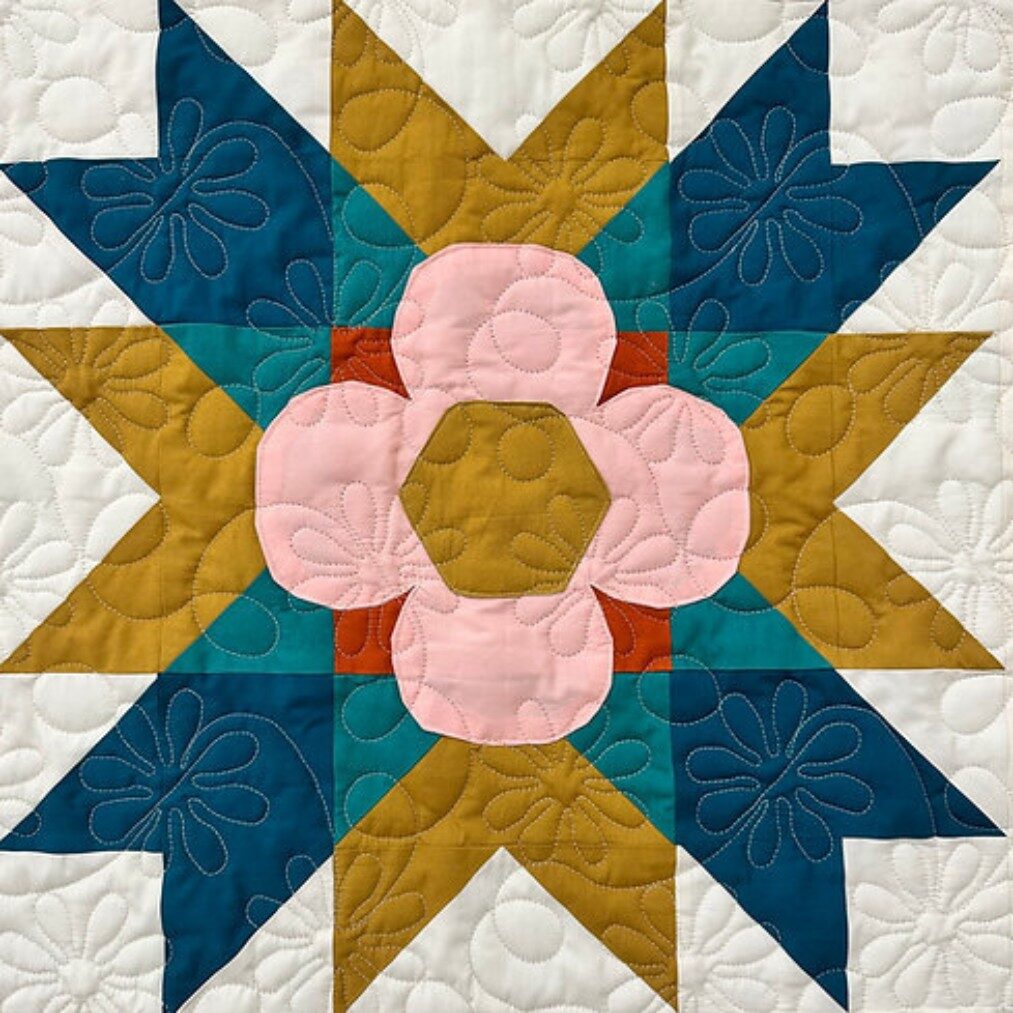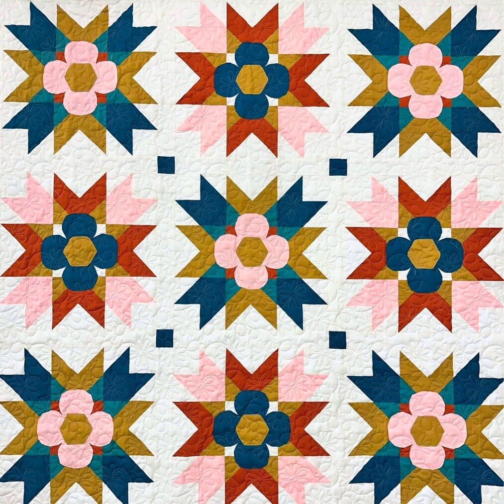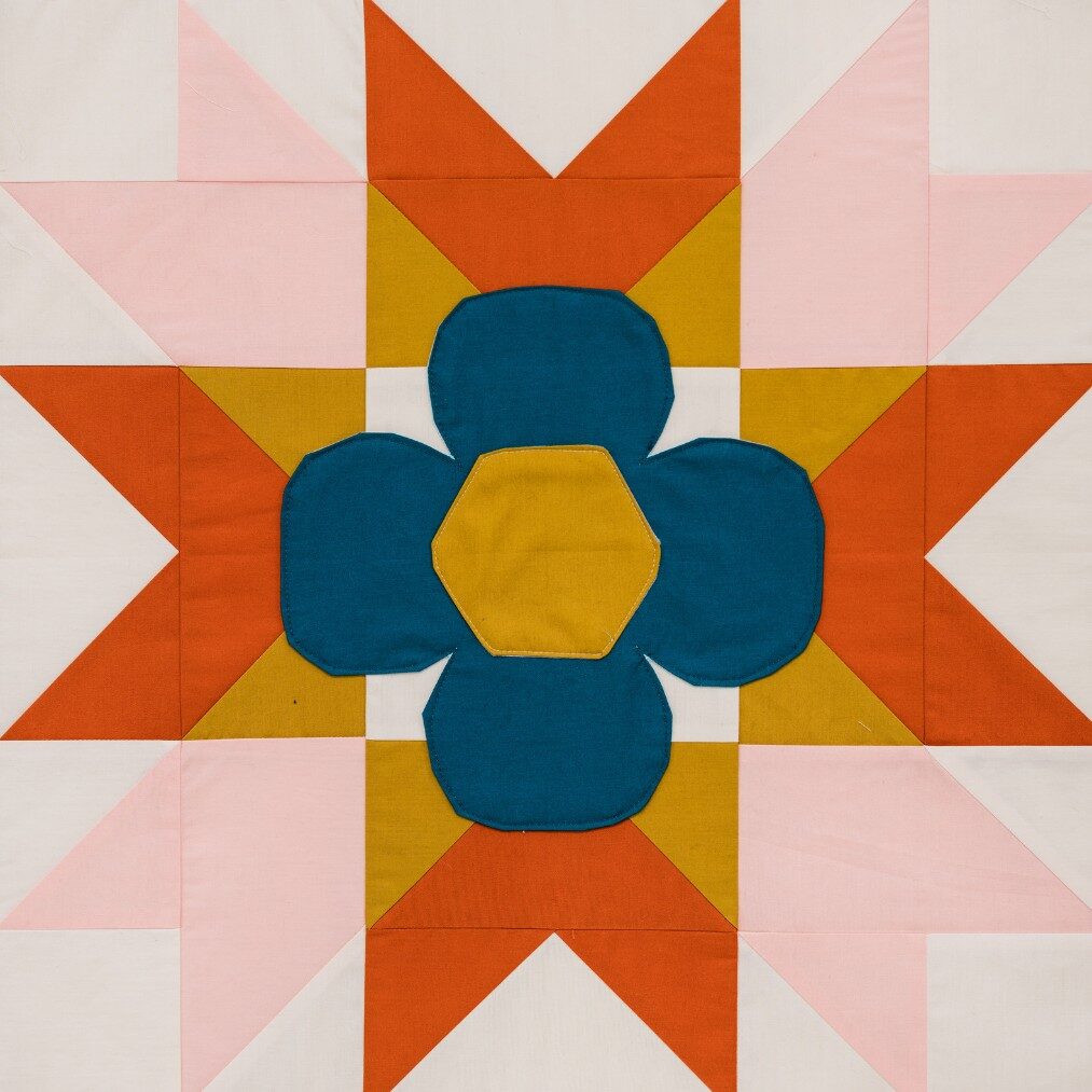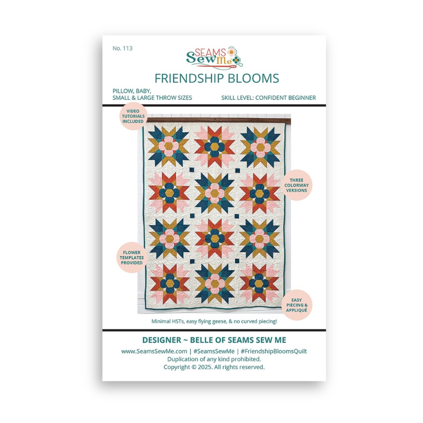 Meet the Friendship Blooms quilt! The floral motif was inspired by the beautiful dogwood petals growing in Arkansas—the appliqué flower is combined with easy piecing to create this special block. It was designed with the appreciation for all of our quilty friendships that bloom over the years.