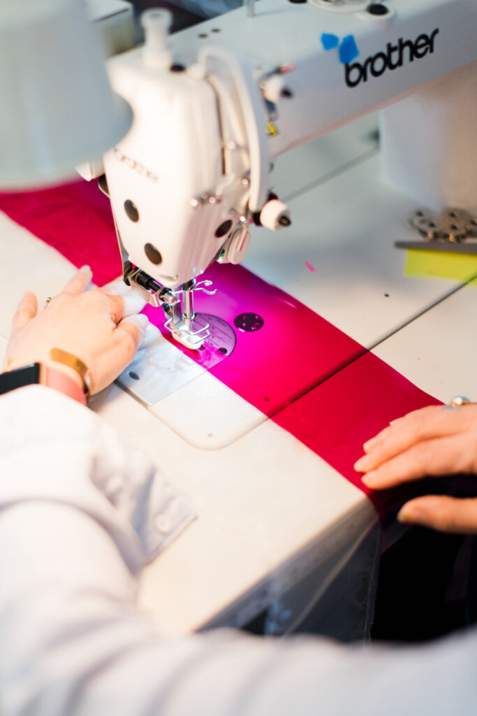 Rachel was working on her piece for IQM while Quiltfolk was there for her photoshoot, which accompanied her feature in Issue 31: Oklahoma. She’s seen here holding a roll of theater lighting gel and working with it on her machine. Photos by Azuree Holloway.
