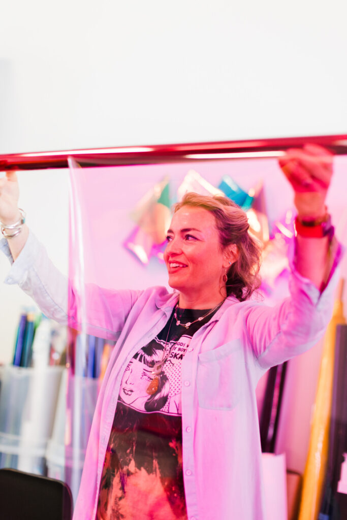 The materials Rachel uses indoors are completely different: see-through “shimmer organza that is used in theater productions to catch light.” Organza strips are sewn next to bright acetate fabrics used in theater lighting gels, which Rachel said are available in 1,000 colors.
