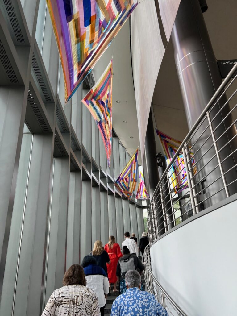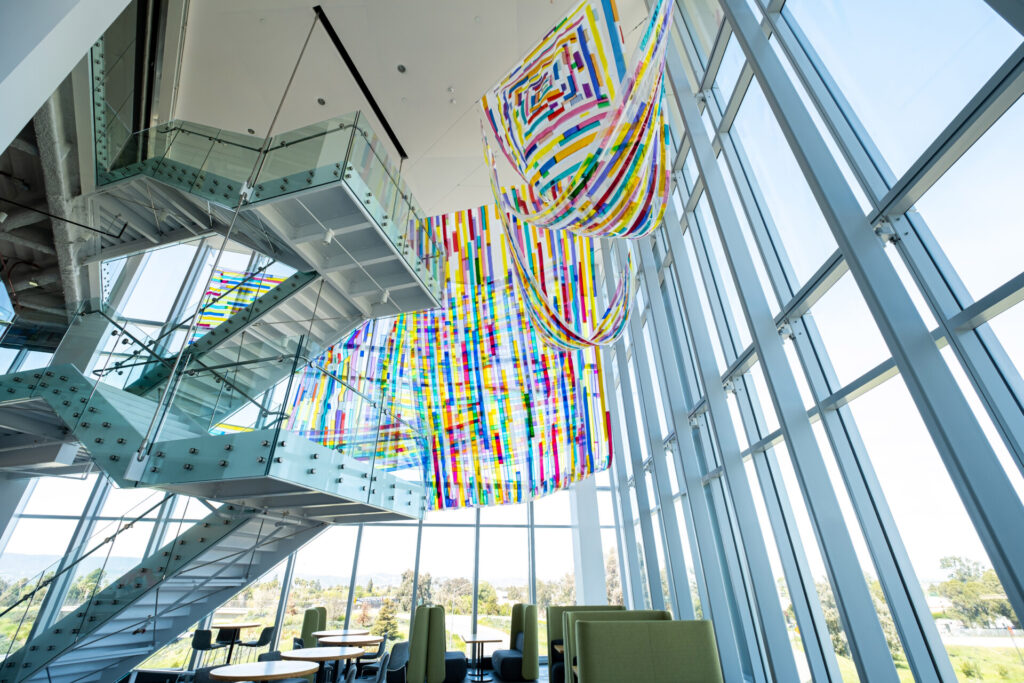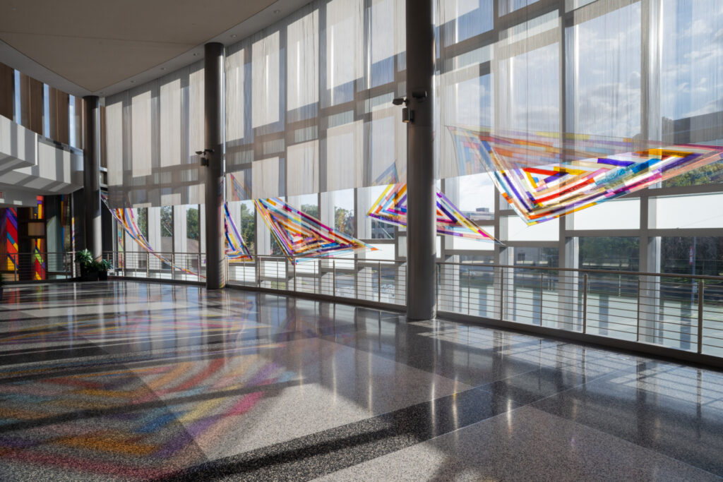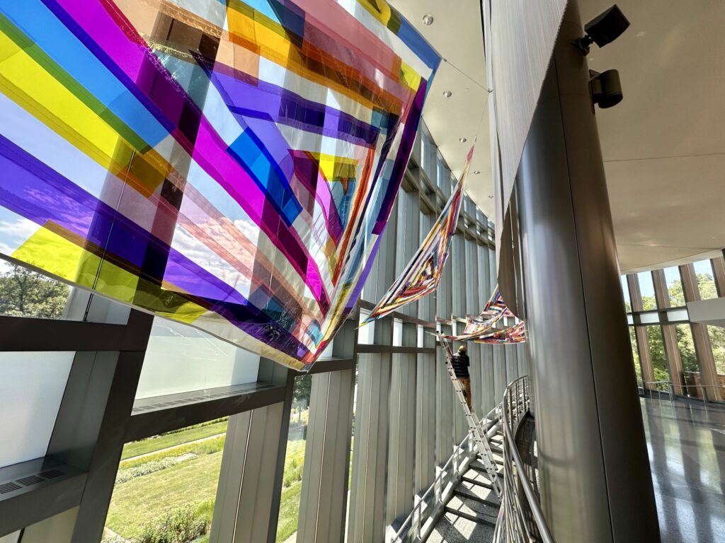 While Rachel creates both indoor and outdoor artworks, The Space Between is both. There is an enormous, brightly colored patchwork triangle that hugs part of the building’s glass façade, and inside, there is a series of 10 smaller triangles hung from the ceiling over a dramatic staircase leading to the galleries.