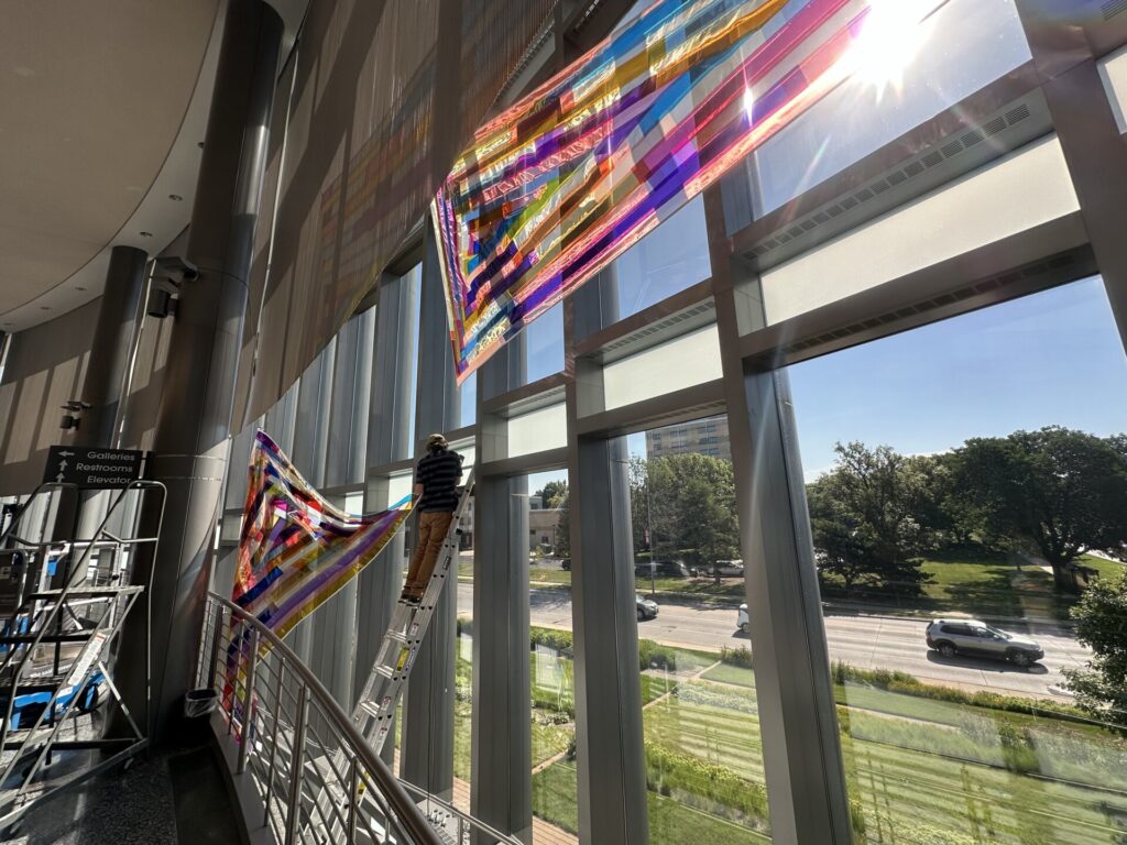 Rachel and the IQM team during the process of hanging her installation. Photos by Jackson Wilde.