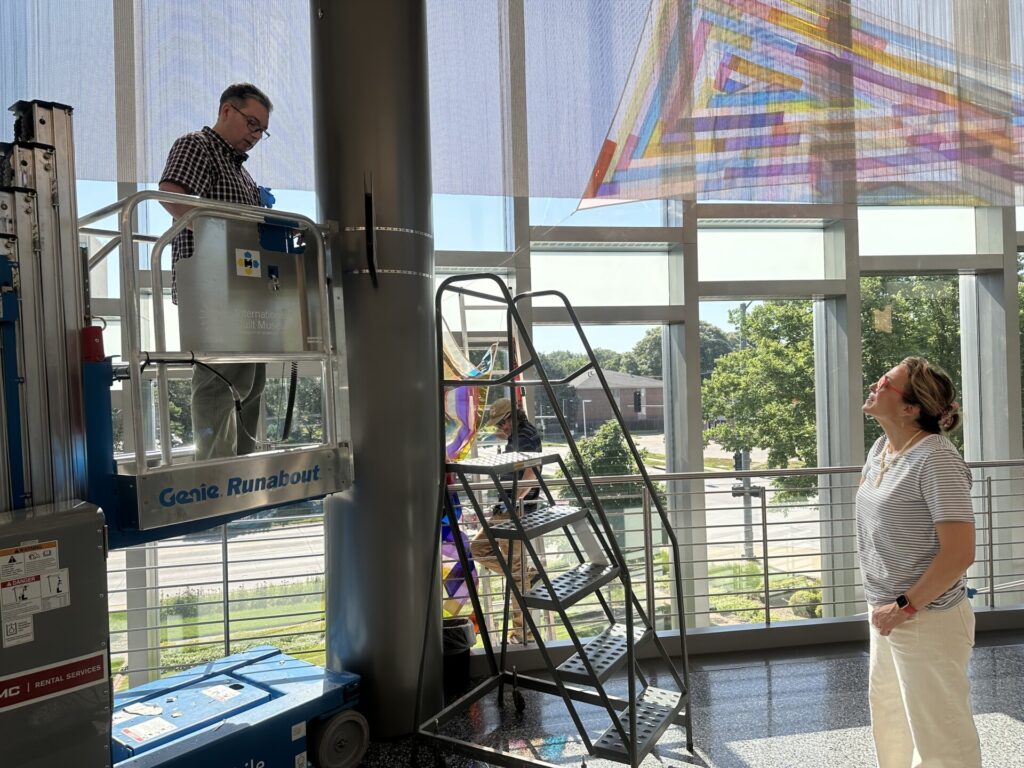 Just taking that long, winding walk up IQM’s stairs, Rachel knew she wanted to hang flag-like elements up high, but there weren’t a lot of places to attach the fabric. “I like to work with a Log Cabin pattern, starting in the middle and working outward, but because of the constraints of hanging things, I thought triangles would be easier than squares,” she said.