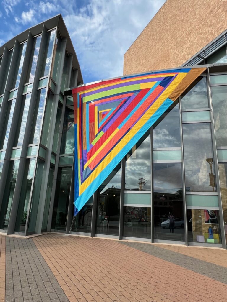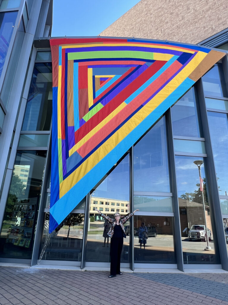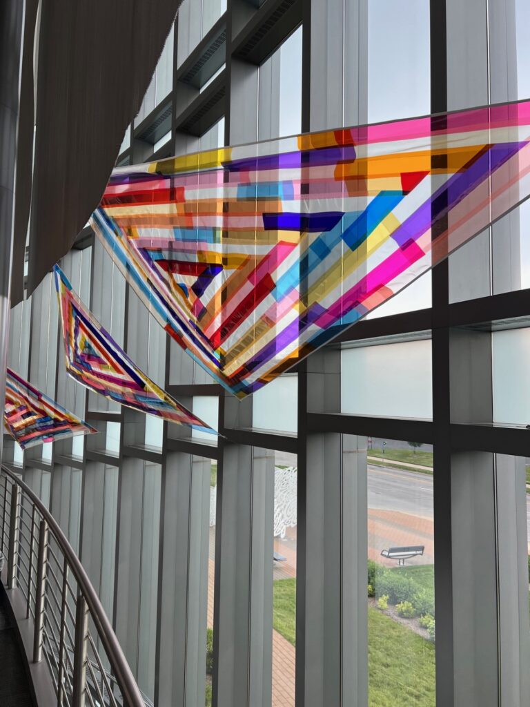 Quiltfolk has already welcomed Rachel as one of us: she was profiled in Issue 31: Oklahoma, in an article titled “Patchwork in the Sky.” Her work at IQM in Lincoln, Nebraska, wasn’t installed yet when that issue was published, but I happened to be attending a board meeting there this summer, right after her piece was unveiled. I got a chance to speak with Rachel then and afterward, in a Zoom interview.