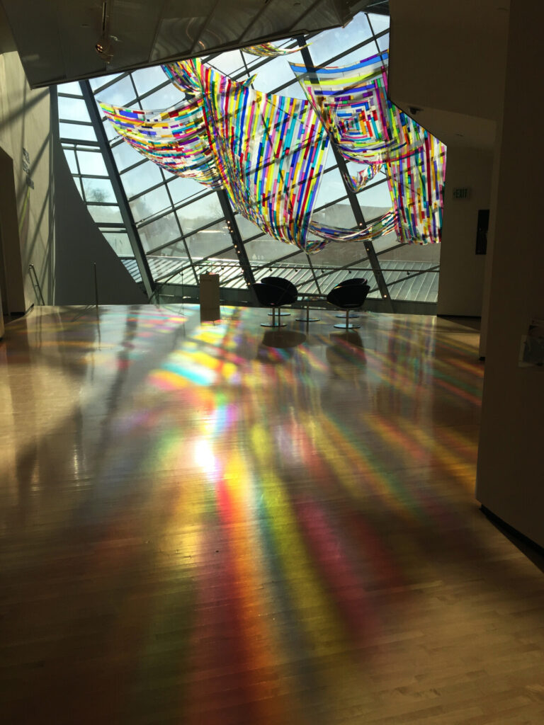 From inside looking out, the big triangle takes on the appearance of a stained glass window. When light streams through both the outdoor and indoor elements, bands of color dance on the floor below, making it seem very kinetic.