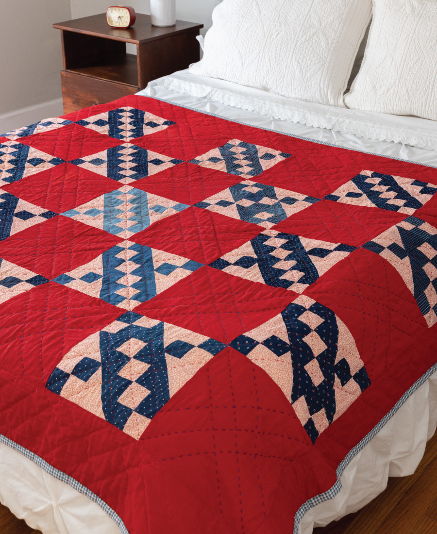 Description: Thirty-five blocks in solid red, blue, and white. Hand pieced. Big-stitch quilted with diagonal grid.