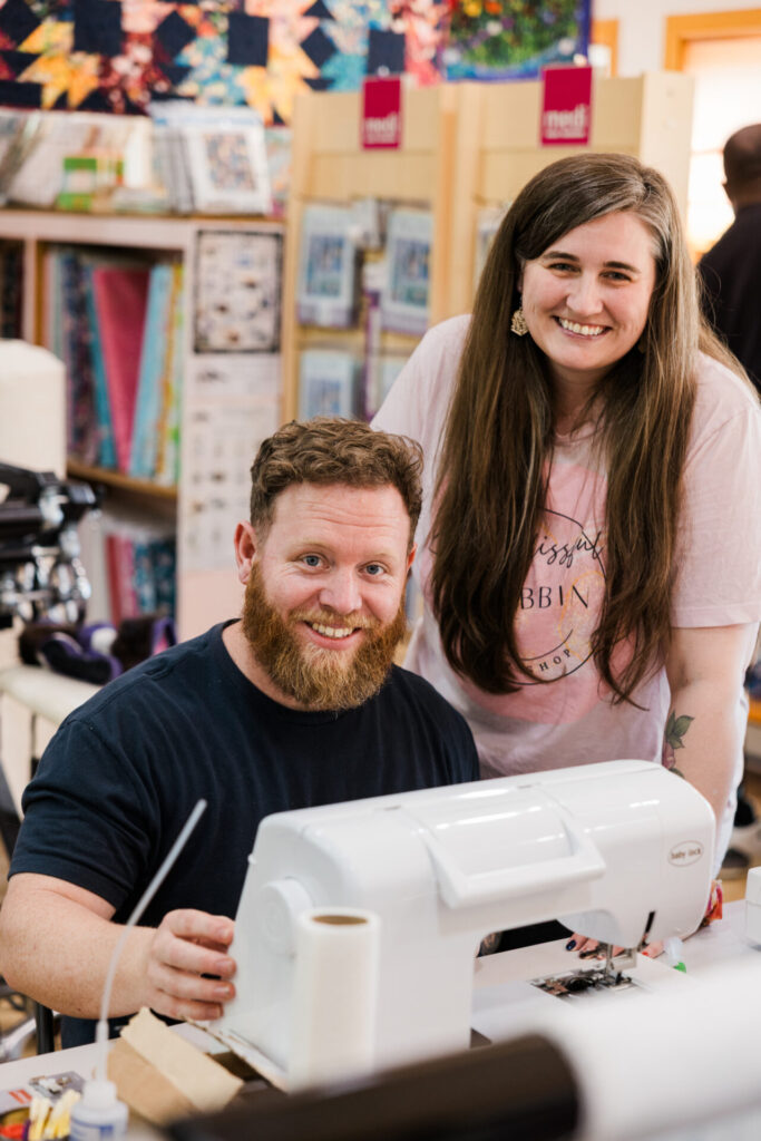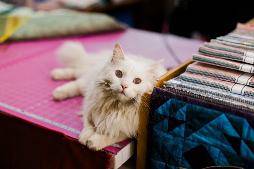 The Blissful Bobbin is more than a business—it’s a family dream in the making. Alan pitches in, repairing sewing machines, while their albino shop cat, Winter, greets visitors with vocal demands for affection. Depending on the day, you may even encounter Stephanie’s mother or sister offering support with stock or customers. She notes that Alaska’s long winters with limited daylight naturally draw local quilters to bright, bold colors that can bring some levity to the darker months. Other popular purchases include fabrics and kits that reflect the outdoors and nature, along with cuddly or minky backings because of their added warmth.
