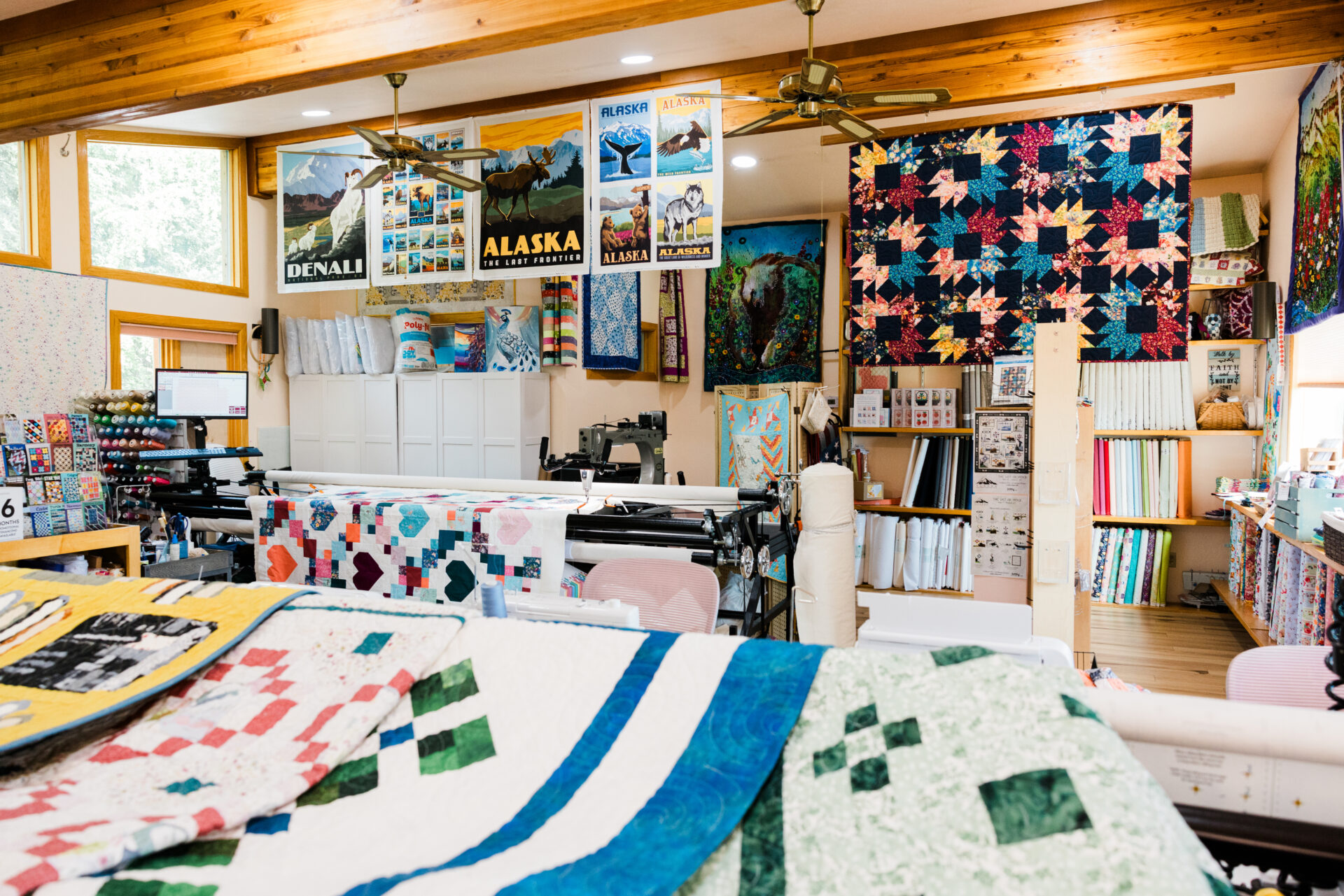 In a cozy home studio nestled above her garage, Stephanie Conner moves effortlessly between her longarm machine and shelves bursting with vibrant fabrics. The hum of the machine lingers in the background as Stephanie expertly adorns quilts that keep her community warm during Alaska’s long, chilly winters. Welcome to The Blissful Bobbin, Fairbanks’ newest quilting haven, where creativity and comfort intersect.