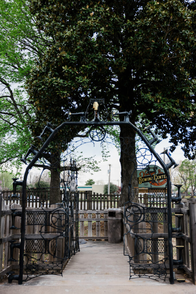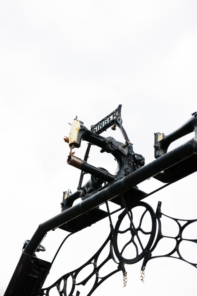 The entry arch of the Vintage Sewing Center and Museum, made of sewing machines!