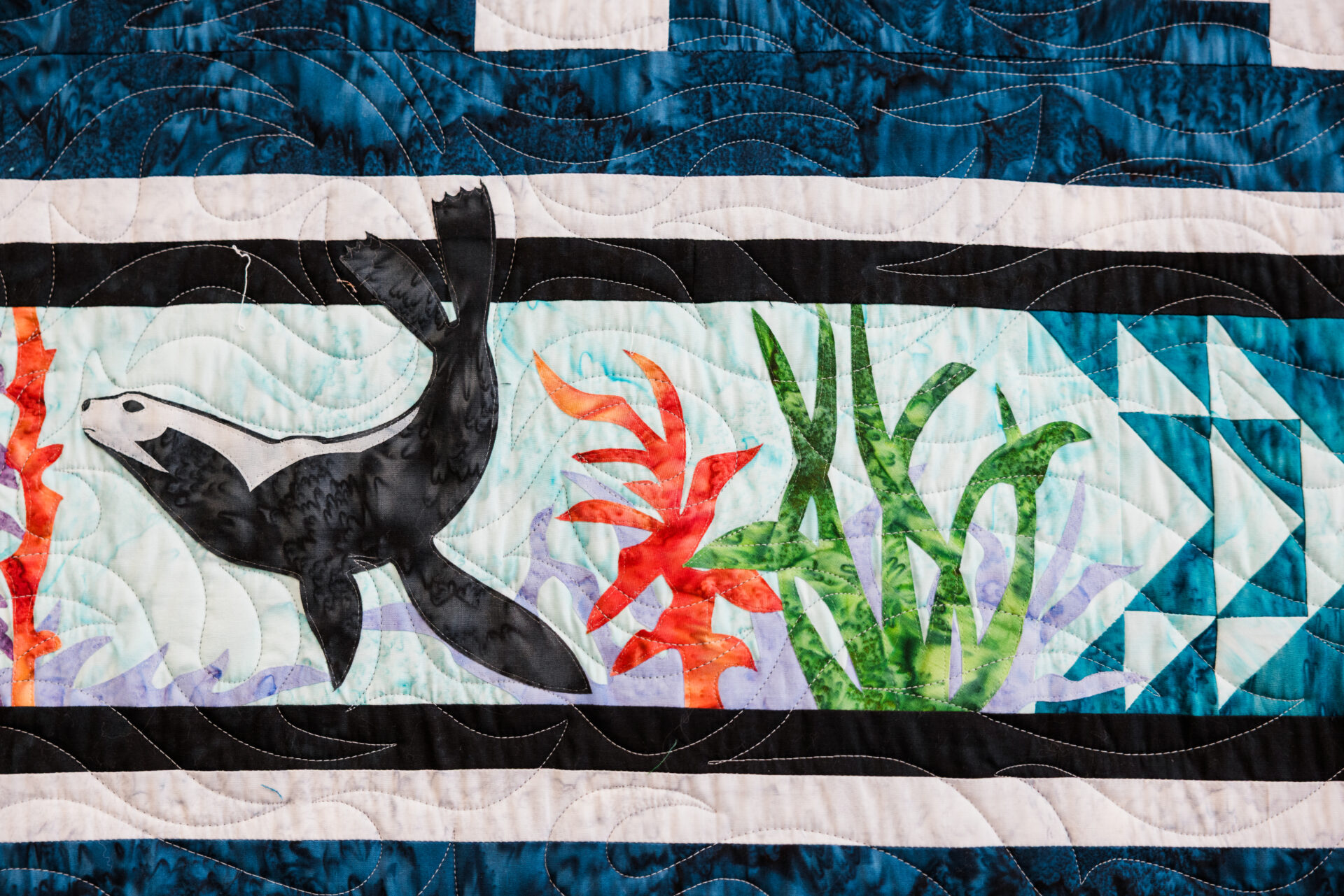 Fourteen shops across the state participated in this year’s hop. Each shop had its own block (each designed by Marie), and the 14 blocks stitched together form The Last Frontier quilt, a marvelous tableau of Alaska wildlife. Among the block designs were arctic foxes and polar bears, ground squirrels, hares, caribou and bald eagles, not to mention grizzly bears, puffins, musk ox, and orcas.