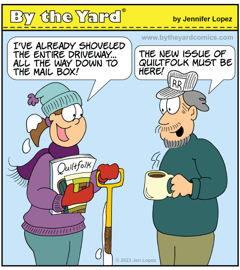 Jen is a New England-based quilter, cartoonist, and pattern designer—and her approach to combining quilting and humor is quite fascinating. In Issue 25, we specifically share what inspired her to create By the Yard, and if you aren’t already familiar with her weekly posts, you can check out the comic she wrote and illustrated exclusively for Quiltfolk below. (And, yes, Jen said that this really happened! We love hearing about this level of dedication from our readers.)