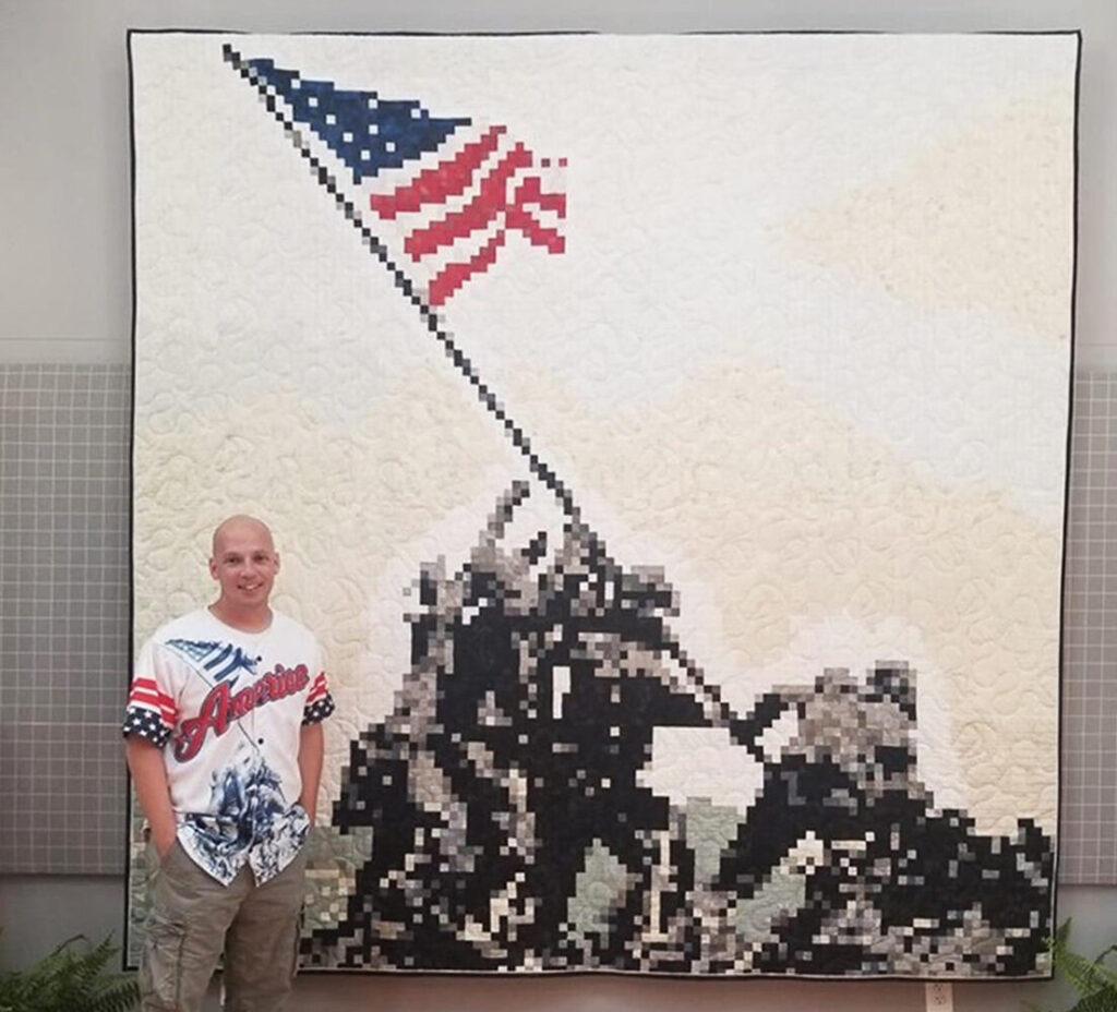 He has made great strides, both with his mental health and his newfound skills. Now Andrew works on a QOV quilt every day. So far, he’s made 687 quilts and gifted all but four. His Iwo Jima quilt Shock and Awe has been displayed at Houston’s International Quilt Festival. He has also designed fabric lines for Timeless Treasure.