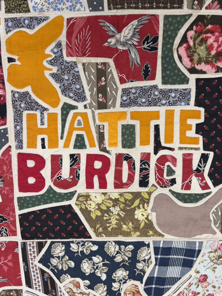 Details of the Hattie Burdick quilt, including the center block where her name is appliquéd.