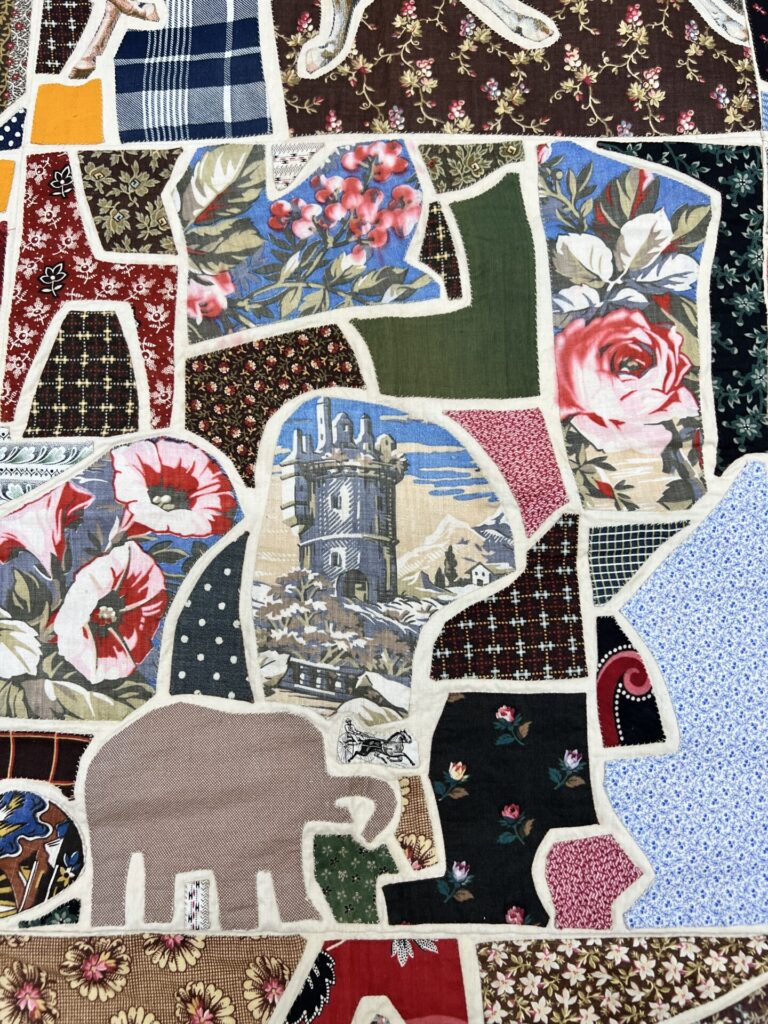 Many of Heidi’s handmade quilts start with a whole cloth base, often a bed sheet, to which she appliqués many pieces of fabric of various sizes and shapes. Some of those shapes are recognizable, like a rabbit or a plant leaf, but others are just pebble-like scrappy bits.