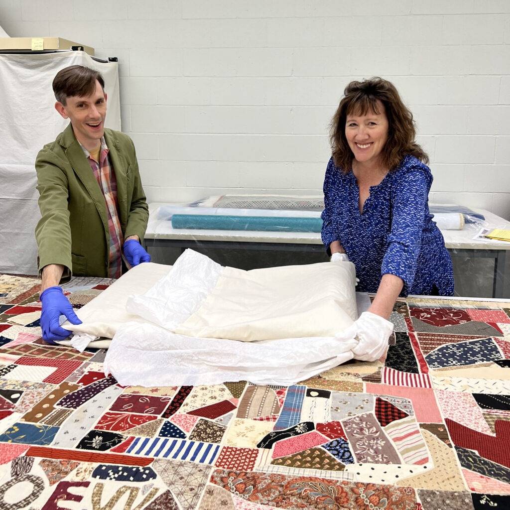 The International Quilt Museum’s Collections Assistant Jamie Swartz (left) and Head of Collections Carolyn Ducey carefully lay out the OEW quilt.