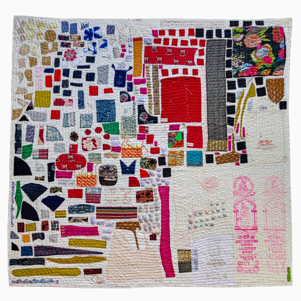 Heidi believes that more direct inspirations for quilting this way include a quilt made by her grandmother when she was little that consisted of 16 blocks with a white background. Various family members appliquéd animals and other shapes into those squares. Her Scavenger Hunt quilt from 2020 includes rows of little wonky squares appliquéd on a background along with bigger bits. Out of her output so far, A Breath Has Four Parts, a quilt she began in 2019 on a trip to India, is the most closely related to a Tile quilt, but her colorful appliquéd bits aren’t corralled into blocks, like most Tile quilts.