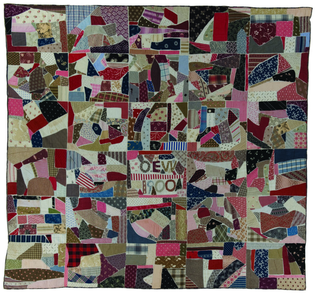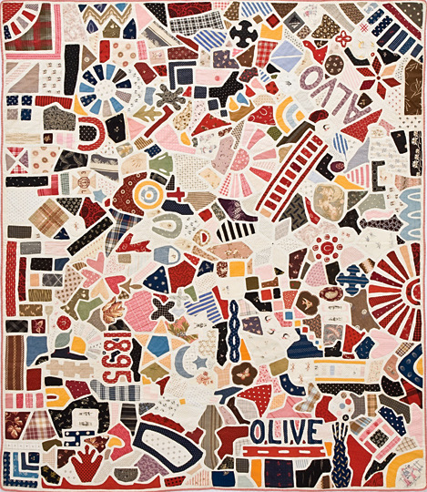 Bobbi Finley said that she first wondered if the names Olive and Alvo appliquéd into the quilt were people, but she shared that there is a Nebraska town named Alvo and a creek named Olive. Sadly, nothing is known about the maker and the circumstances under which this was made. But it’s the brightest and most exuberant of the Tile quilts I’ve seen. Did she give herself any kind of plan or grid? Where did she start and stop? I love that the maker didn’t feel she needed the restrictions of blocks. It feels so modern to me and makes me want to start cutting and stitching my own free-spirited variation.
