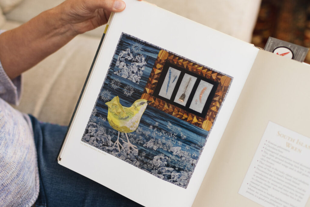 For Inspired by Endangered Species, Gay selected the South Island Wren, and that little bird has its own special story. After mailing off her completed quilt, Gay attended what was to be a very zen watercolor and yoga retreat to disengage during a stressful time in her work life. Chatting with fellow retreat participants about her fiber artwork, Gay explained that she incorporated real feathers, collected on hikes over the years, into her South Island Wren quilt. A participant informed her that it’s illegal to own feathers unless you are a Native American. Distressed, Gay ran back to her room to research this, and sure enough it is in violation of the 1973 Endangered Species Act – the very thing that the challenge was honoring. The publisher was photographing the quilts, when Gay called the author, “I was in a tizzy, but Donna calmed me down and offered to return the quilt to me if I could quickly make a revision.” Gay ripped the feathers off black velvet and painted feathers in its place, getting the quilt to the publisher in time.