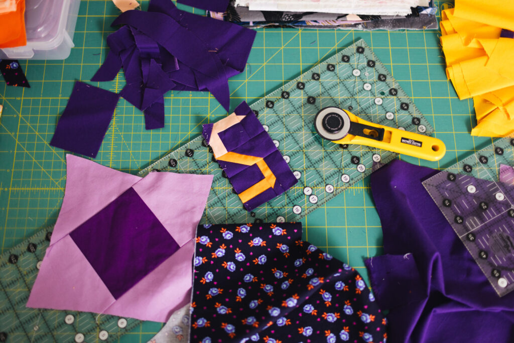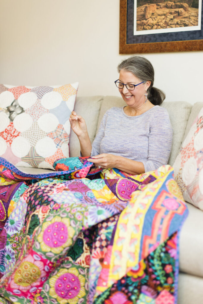 Noticing her interest in junior high school home economics and sewing classes, her dad bought her a white Singer Featherweight sewing machine, which she used on and off through high school. Quilting came in 2002, when she met a friend for lunch. The friend, a quilter, asked if they could pop into a local quilt shop for a minute. Gay was in awe of all the colors and patterns and said, “Whatever this is, I need it in my life!” Now she needed her sewing machine which she left at her parents’ home during college. Gay recalls her dad saying, ‘no you can’t have it. I use it’ to repair pant seams and the lawn mower bag! She offered to buy him his own machine and that convinced him to let her take back her Featherweight. Gay remembers starting her quilting journey with scissors, plastic templates, and a ruler to add a quarter inch seam allowance.