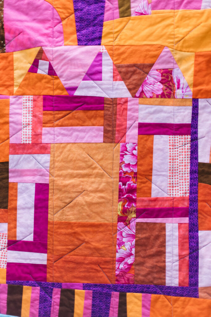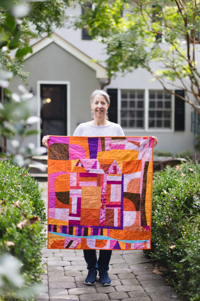 During the pandemic, Gay took advantage of virtual classes, further expanding her repertoire of skills. She joined the Central New Jersey Modern Quilt Guild and heard Sherri Lynn Wood speak. “It blew my mind! I woke up in the middle of the night with three ideas and I had never done a modern quilt before,” Gay said. Now her work is primarily in an improvisational modern style, although she still does pictorial quilts for specific challenges. She likes to try new techniques, so working in a series is not her thing, “after two or three similar pieces, I’m ready to move on. Challenges are helpful in that regard,” she explained.
