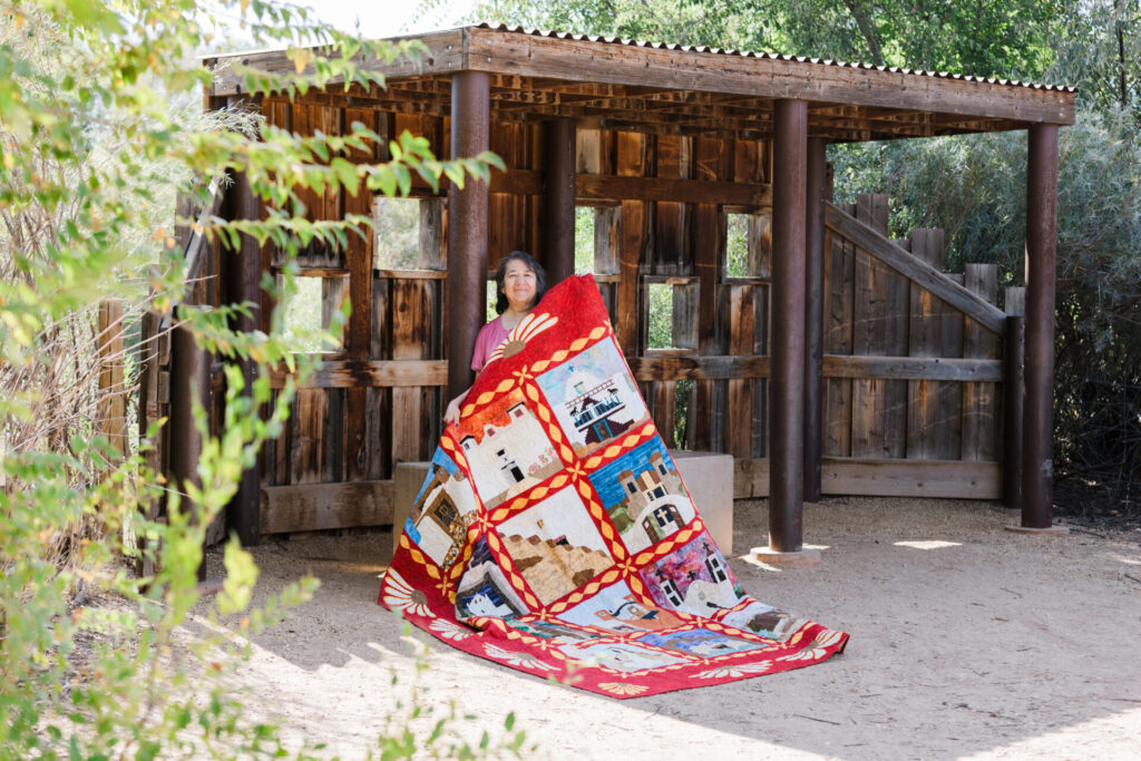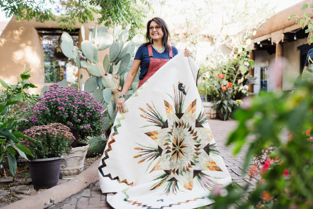 Priscilla Bancroft is an enrolled citizen of the Ute Mountain Ute Tribe, and she is also part Pueblo. She grew up in Ohkay Owingeh, just north of Santa Fe, and she simply loves making Star quilts. She started quilting in 2019, and since then, it’s become an important part of her life, as well as that of her partner. The Star quilt pattern is especially precious to Priscilla because it is a beloved icon in Native American culture and a favorite quilt pattern to make and give away.