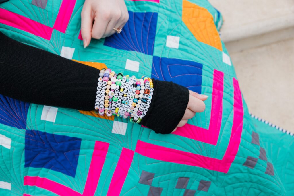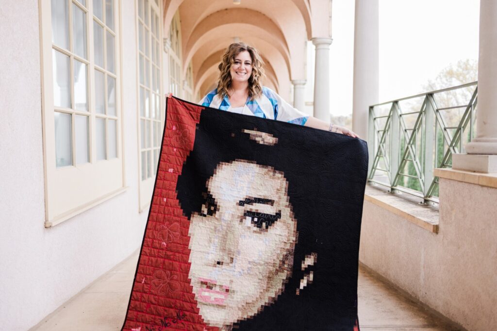 Dee Bushrod quilted for many years before she found a process she truly loved. Pixel Quilts was born from a desire to create quilted pixelated portraits, and she has made many over the last three years, from celebrities to the late Queen Elizabeth II, even to a self-portrait. Dee works from her home studio in Tulsa, where she’s made so many quilts that, sometimes, she wonders if she’s neglecting her family. (She’s not—they’re very supportive.)