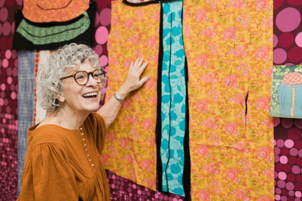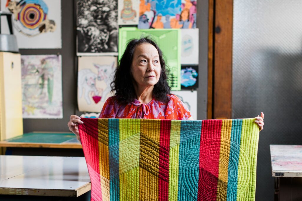 Ann Solinski’s journey into modern art quilting began with a surprise gift, leading her to craft unique pieces that have been exhibited across Oklahoma. Embracing her Korean heritage, she blends tradition with innovation, infusing her quilts with vibrant colors and personal narratives to create striking textile art. Along with six other Oklahoma artists—five quilters and one painter—Ann is part of a unique art collective known as Qu’aint. This collaboration between paint and textile has inspired each artist to think in new ways and ultimately helped elevate their creative output.