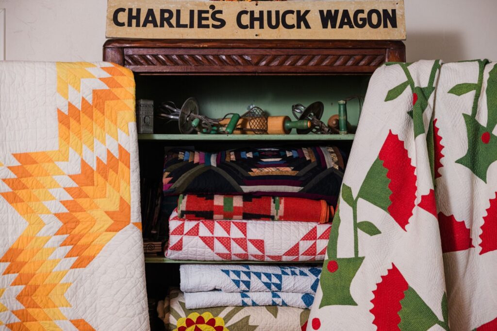 Cindy Rennels’ passion for horses led her from the plains of Illinois to the heart of Oklahoma’s equine culture. Initially immersed in the world of barrel racing, she took an unexpected dive into the realm of antique quilts and became a prominent figure in the quilting community and a respected seller with a vast inventory. The more quilts she bought, the more she fell in love with them and inevitably began building a collection of her own, while continuing to run and revamp her business amidst life’s unpredictable twists and turns.