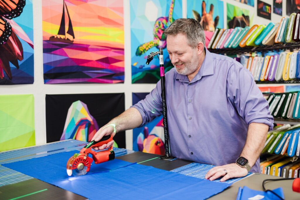 Jason Wilson, a geometric painter from McAlester, finds inspiration in patterns, meticulously handcrafting vibrant works that often defy belief. Drawing from childhood memories spent with his quilting “grandmas,” his process pays homage to familial artistry while also pushing the boundaries of his craft. Now, he spends hours explaining to people that he didn’t use a computer to get his precise, mind-bending compositions. He is also part of a unique art collective called Qu’aint, consisting of five quilters and one painter. This collaboration has the makers creating quilts inspired by Jason’s paintings and vice versa.