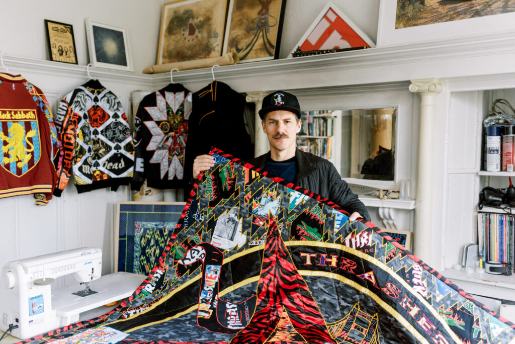 Ben Venom’s quilts are inspired by Gee’s Bend, Atlanta punk, and skateboarding counter-culture, pulling together a hybrid fusion of textures, patterns, and techniques to create work that practically screams “off the wall”—in a good way.