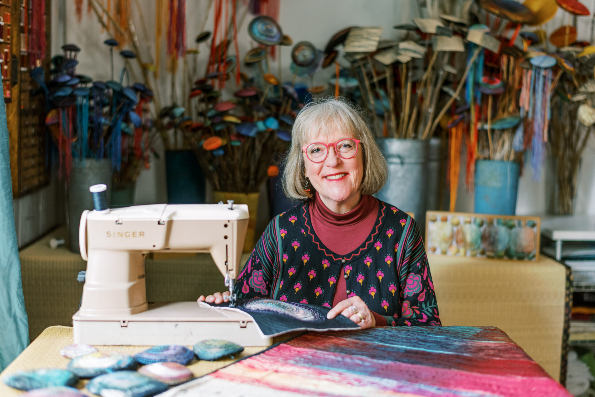 Alice Beasley’s subject matter follows her curiosity and interests as they develop, which makes for a robust body of work. In addition to portraits of American presidents and commentary on gun control, this Oakland-based fabric artist has also been commissioned to create wall hangings that show the comfort and power of community for hospitals and care centers.